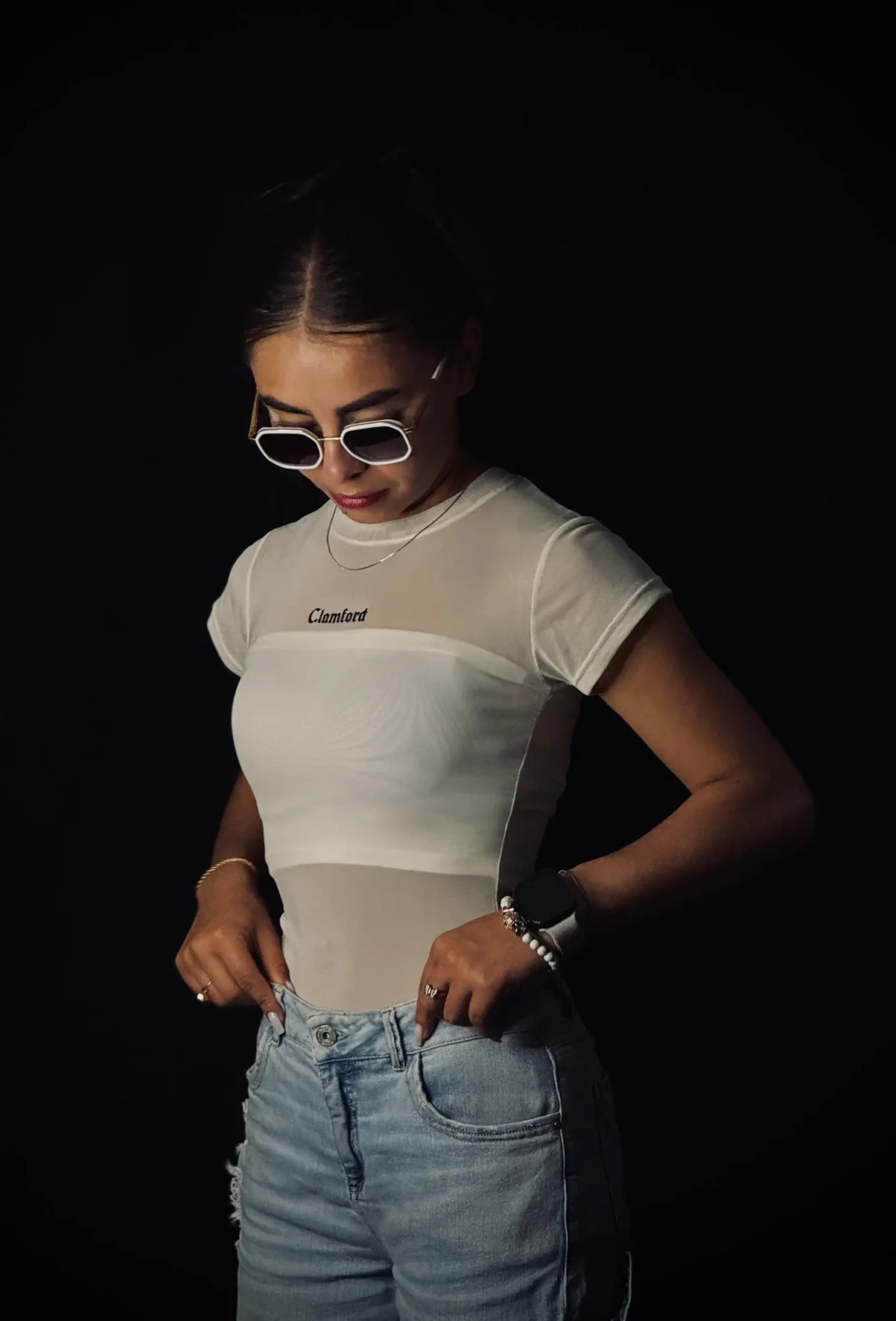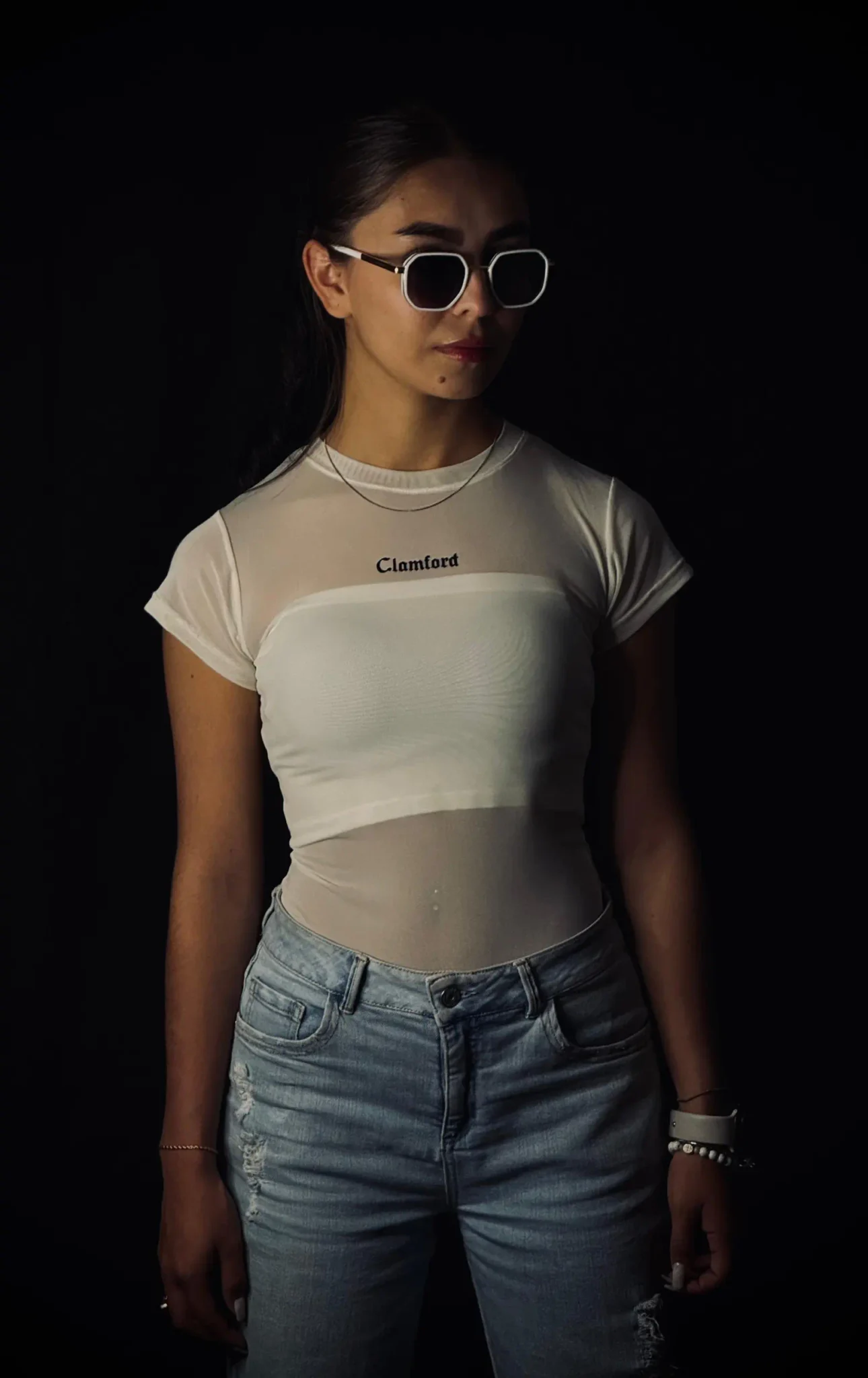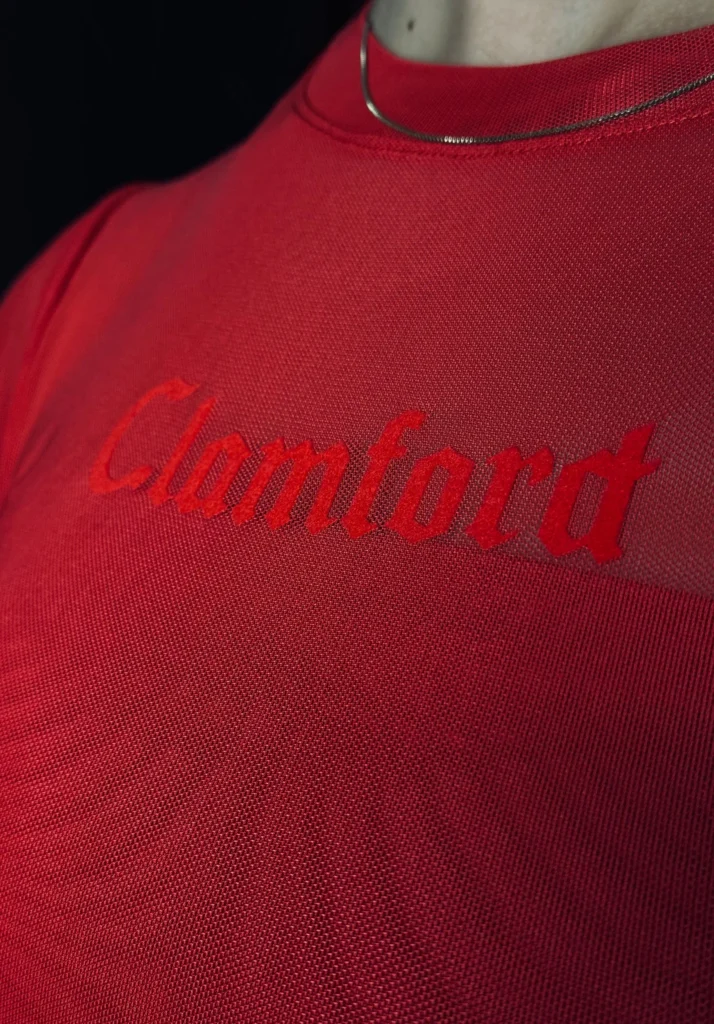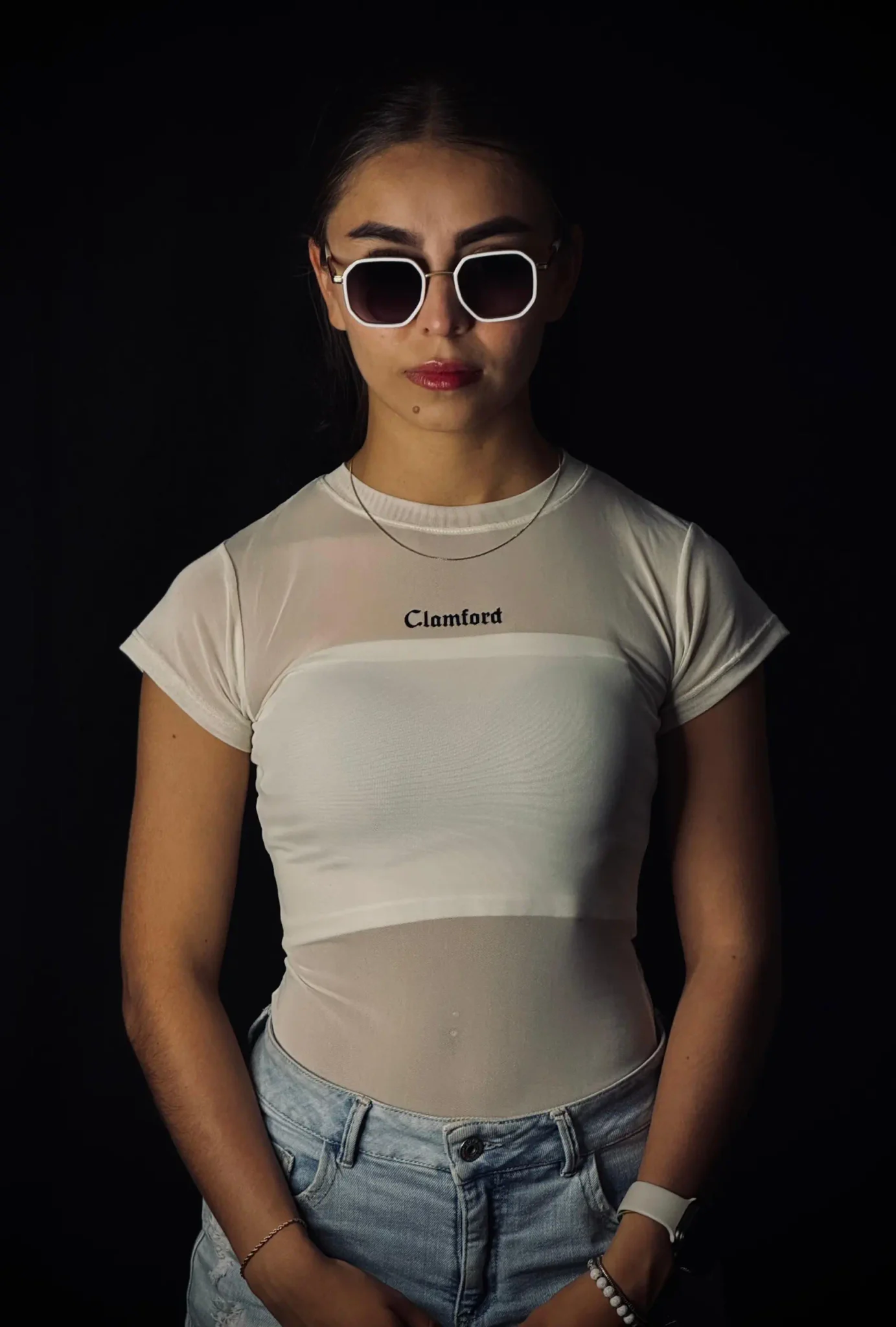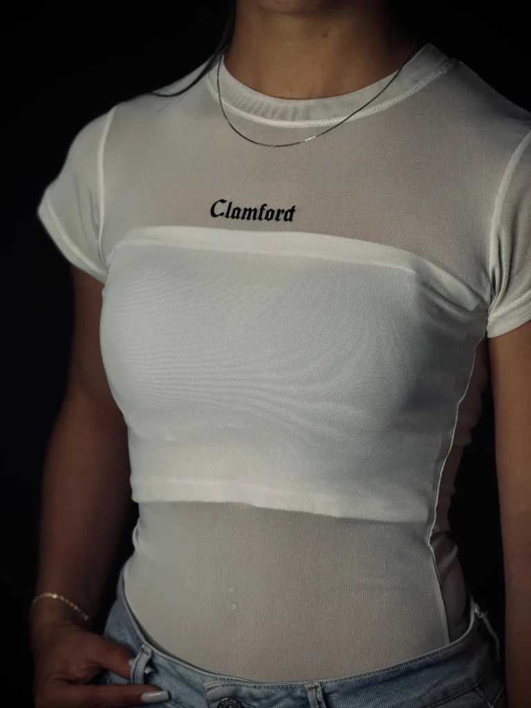 Body manga corta, confeccionado en tela mallatex con composición de 94% poliéster y 6% spandex, que brinda ligereza, elasticidad y un ajuste ceñido al cuerpo. Presenta un texto en acabado engamuzado sobre el pecho con la marca Clamford. Al ser una malla, incluye un straple para usar por debajo, broches en la entrepierna para mayor practicidad y comodidad en el uso diario.