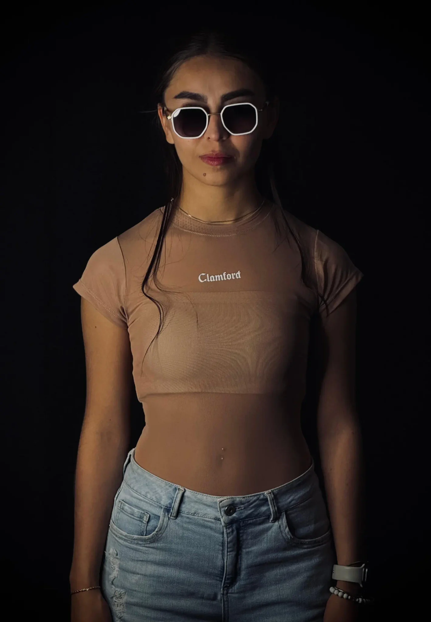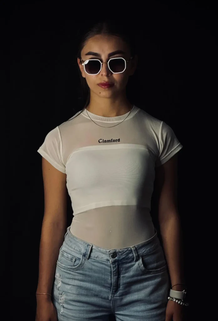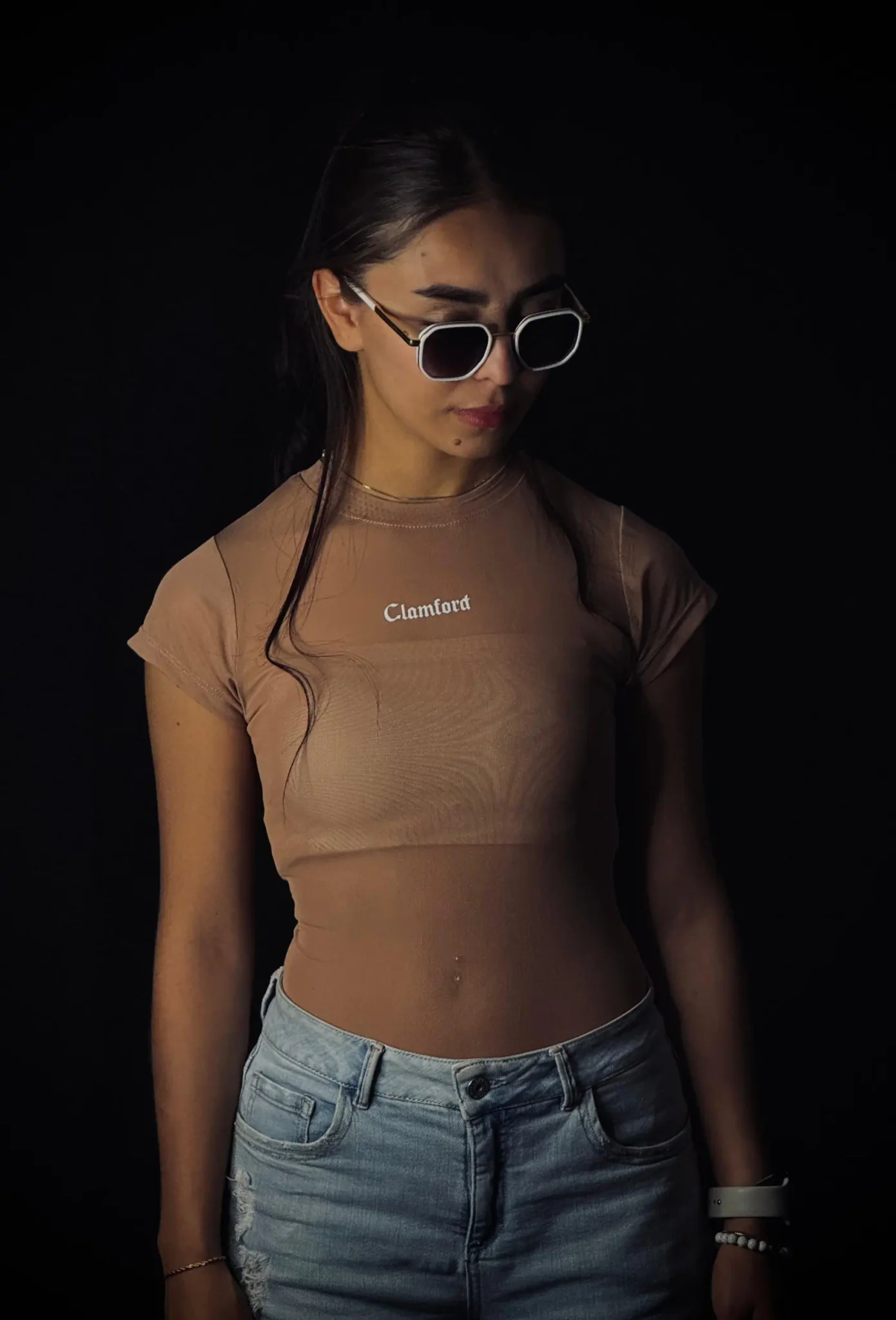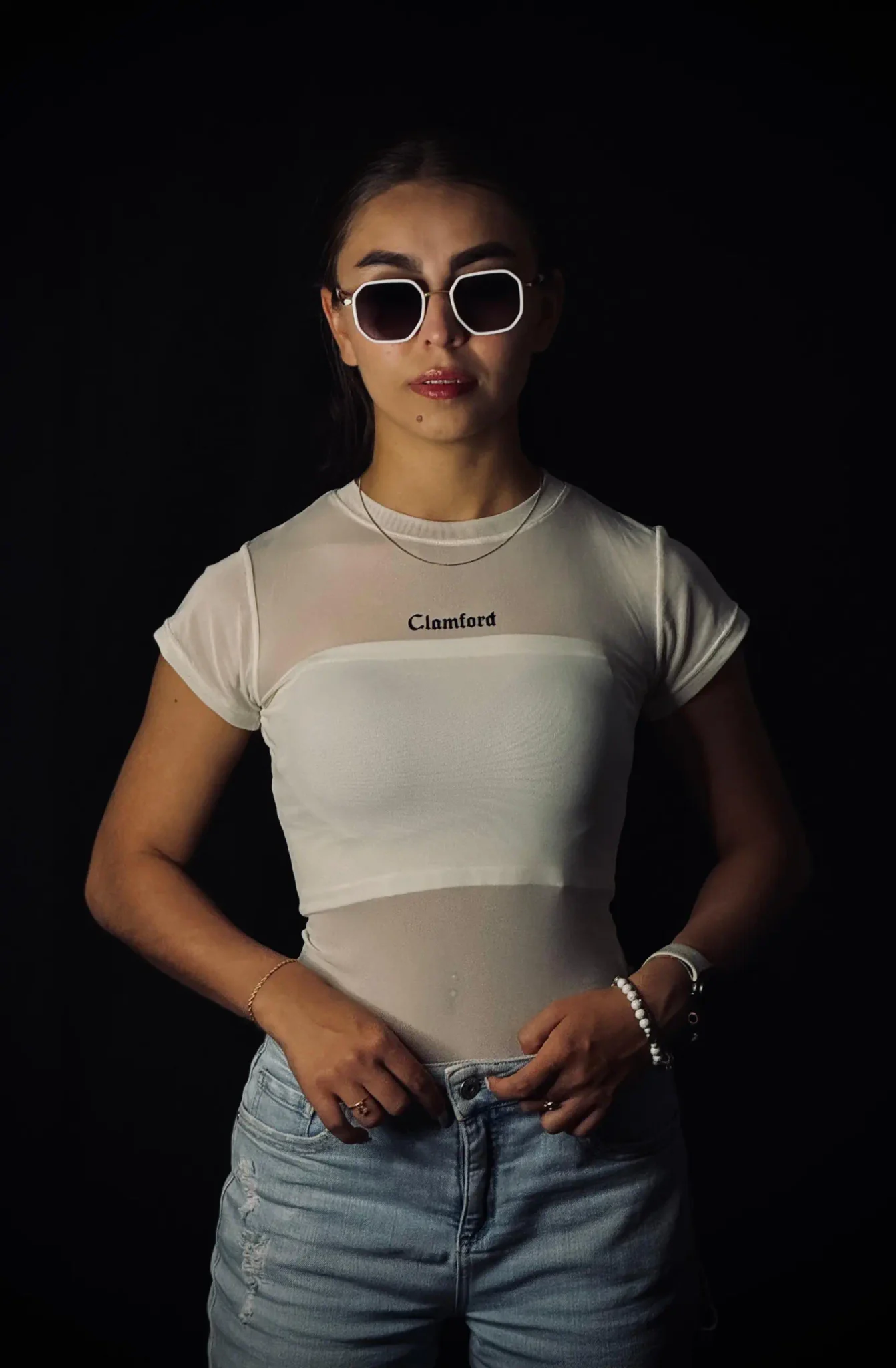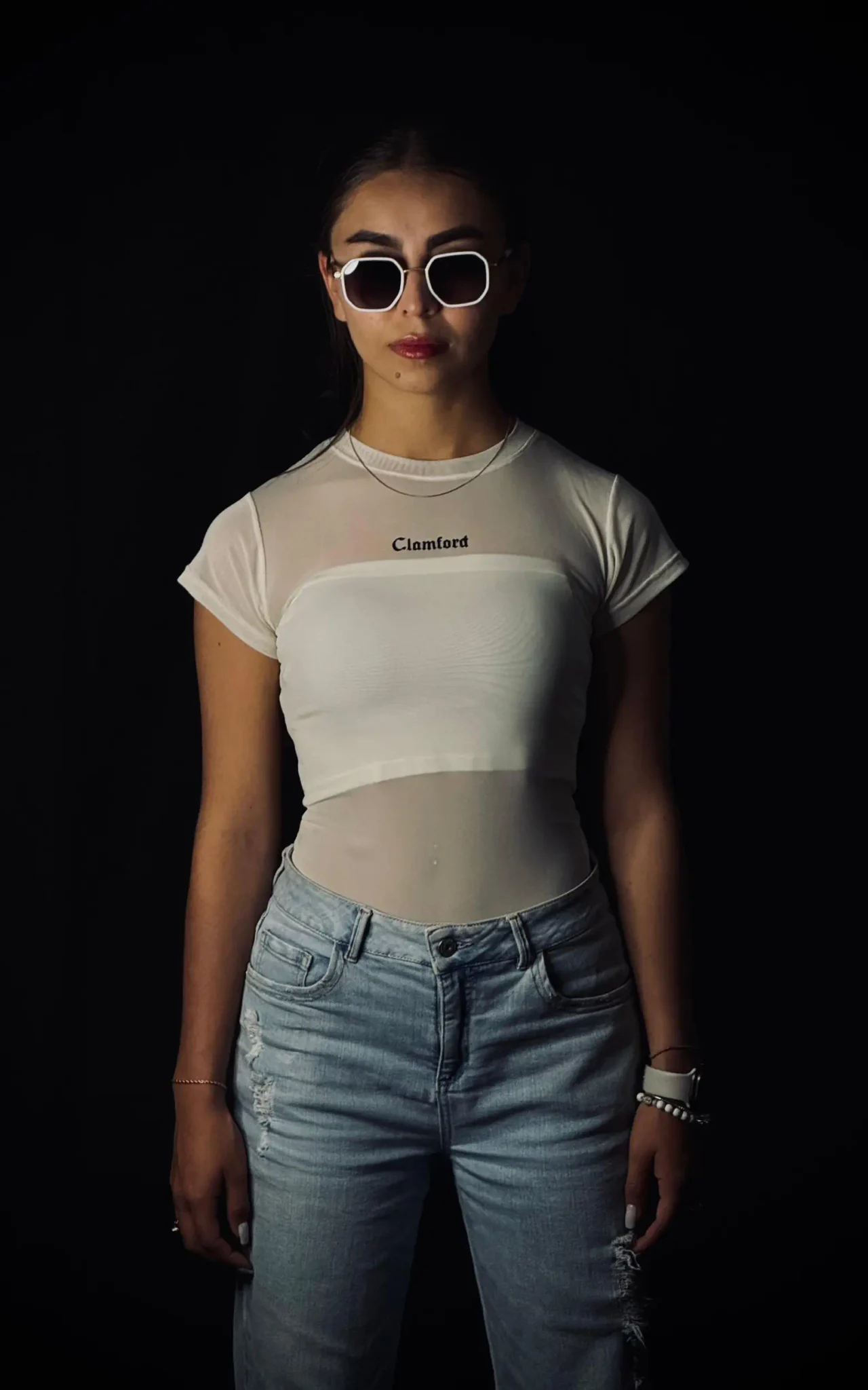 Body manga corta, confeccionado en tela mallatex con composición de 94% poliéster y 6% spandex, que brinda ligereza, elasticidad y un ajuste ceñido al cuerpo. Presenta un texto en acabado engamuzado sobre el pecho con la marca Clamford. Al ser una malla, incluye un straple para usar por debajo, broches en la entrepierna para mayor practicidad y comodidad en el uso diario.