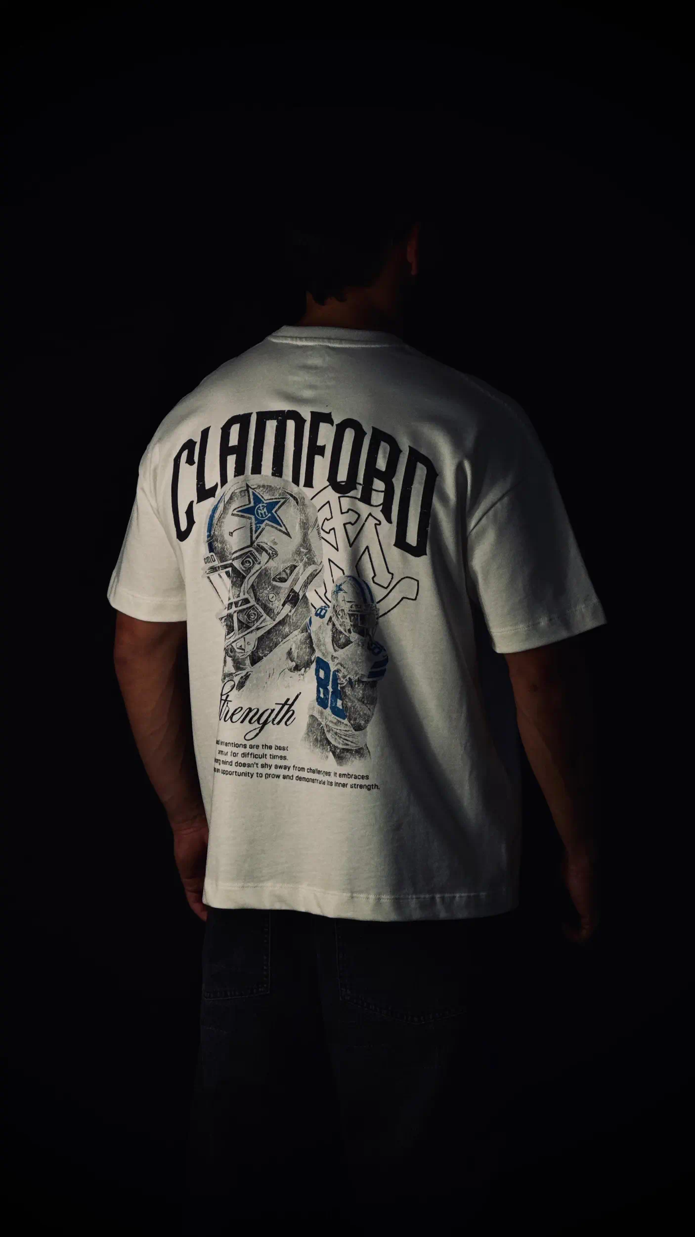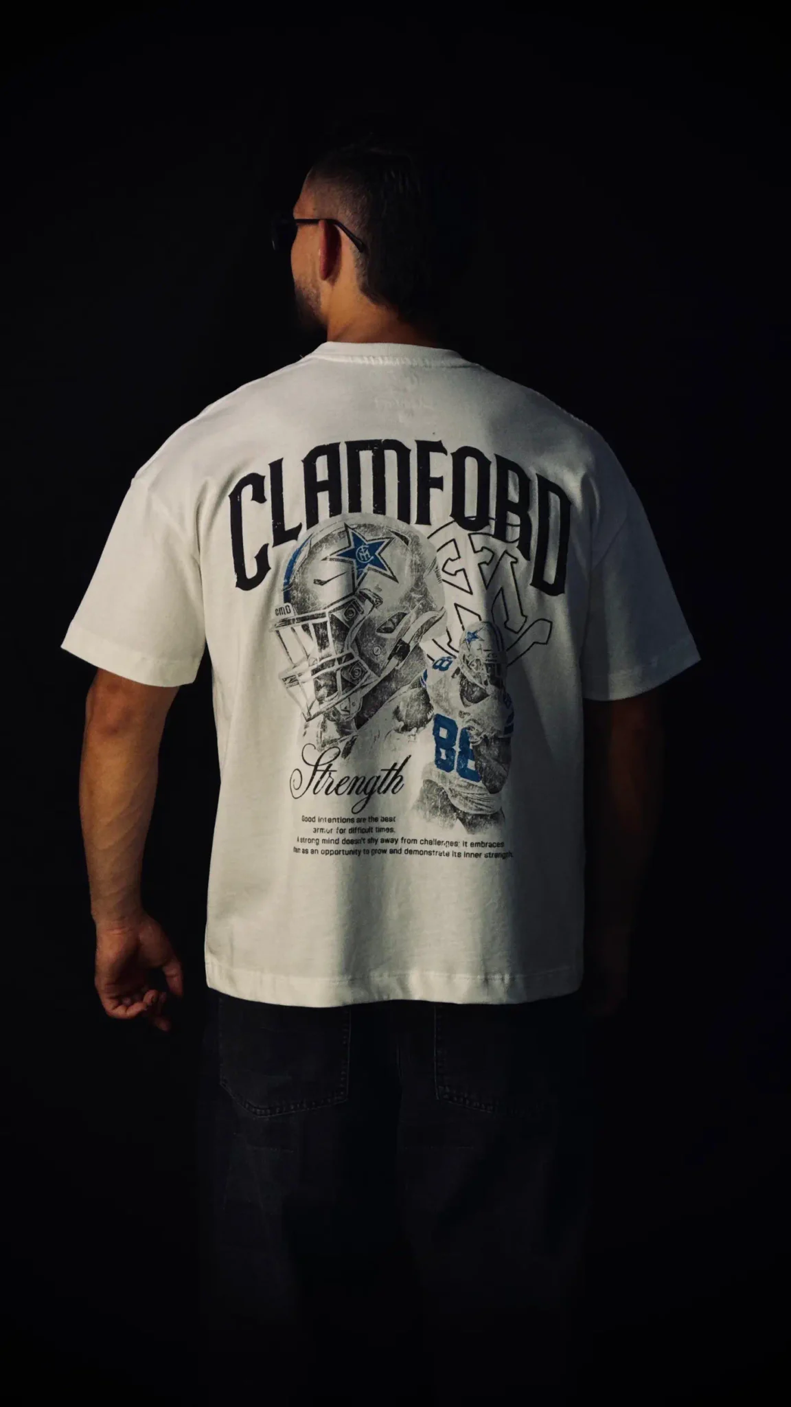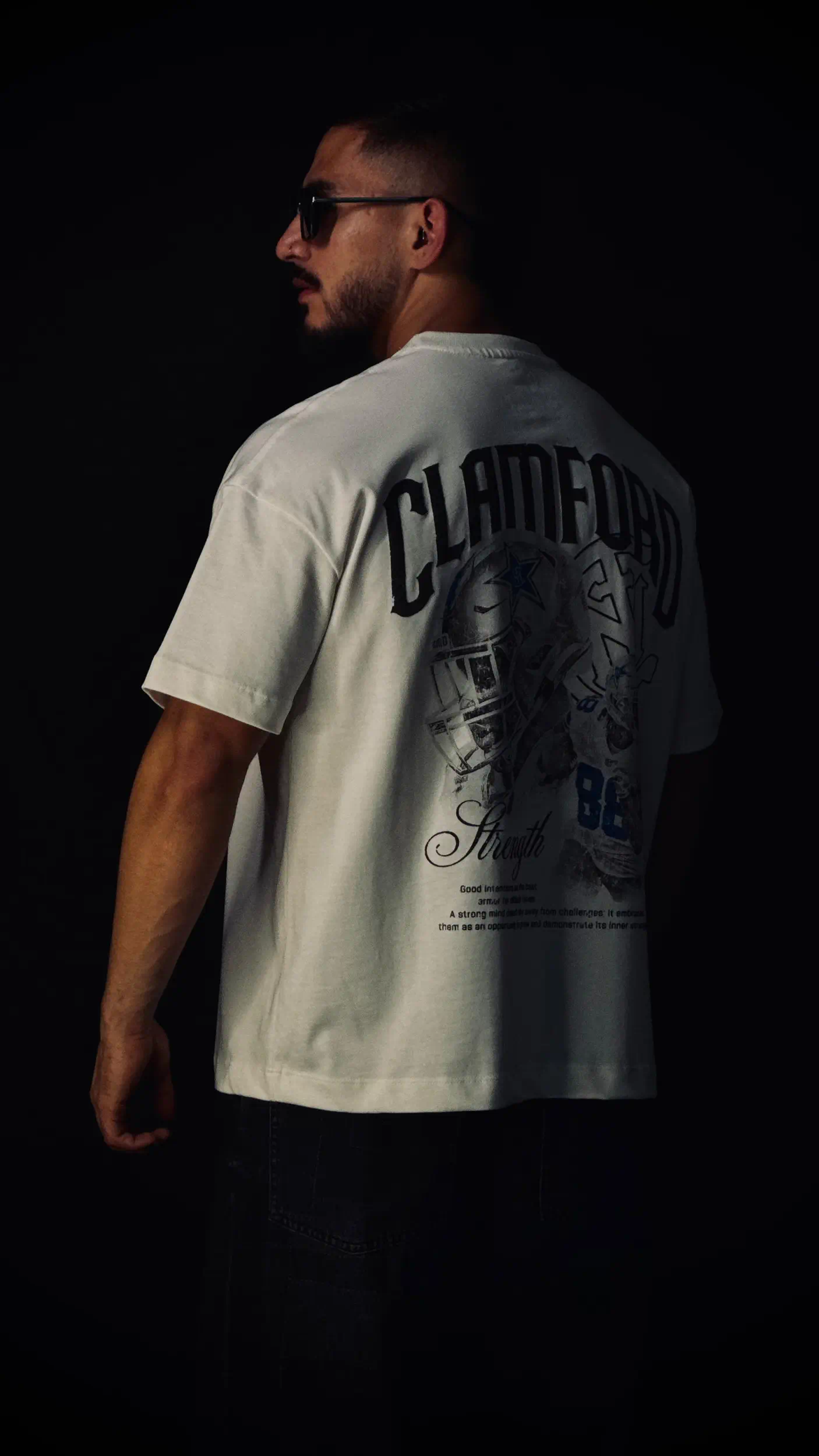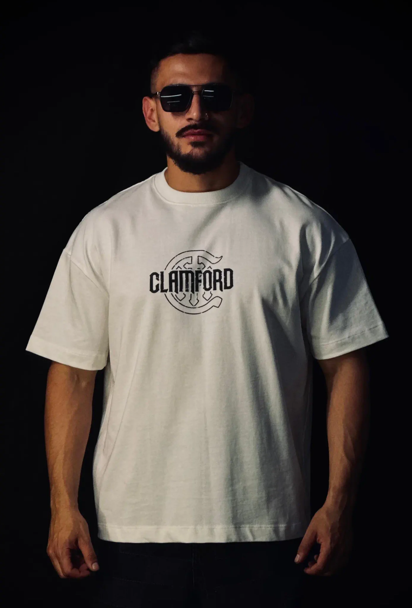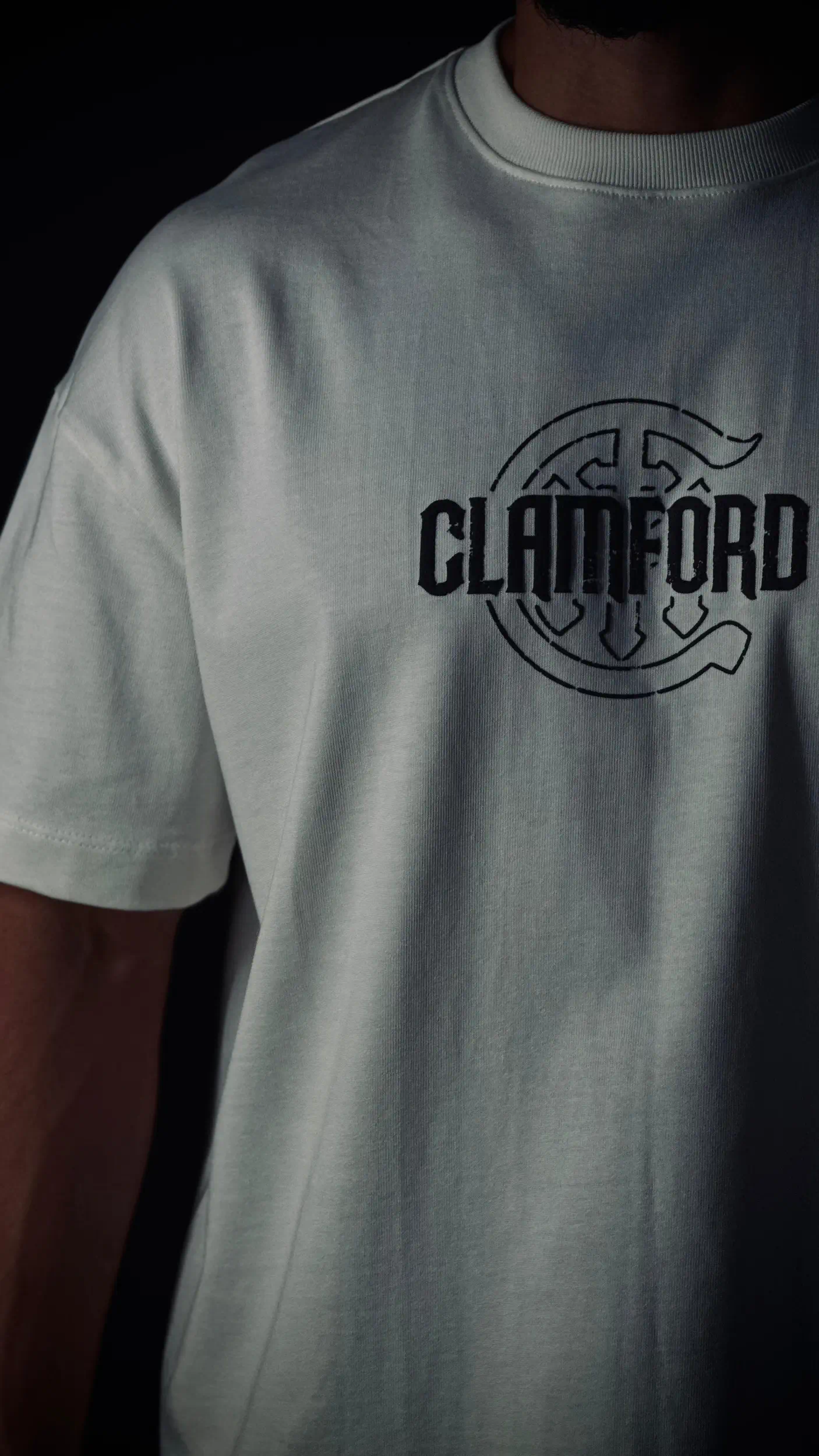 Camiseta oversize en jersey premium de alto gramaje (310 g) con cuello en rib tejido acanalado 1×1. Presenta estampación frontal en puff y textil y gráfico trasero en puff con identidad Clamford.ESPECIFICACIONES