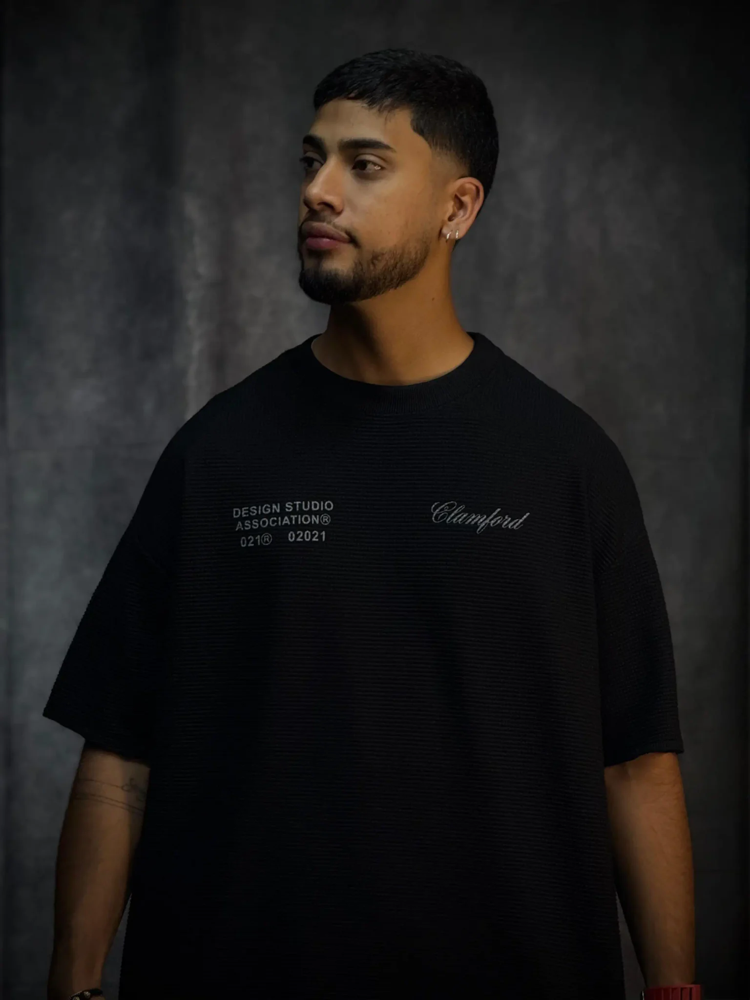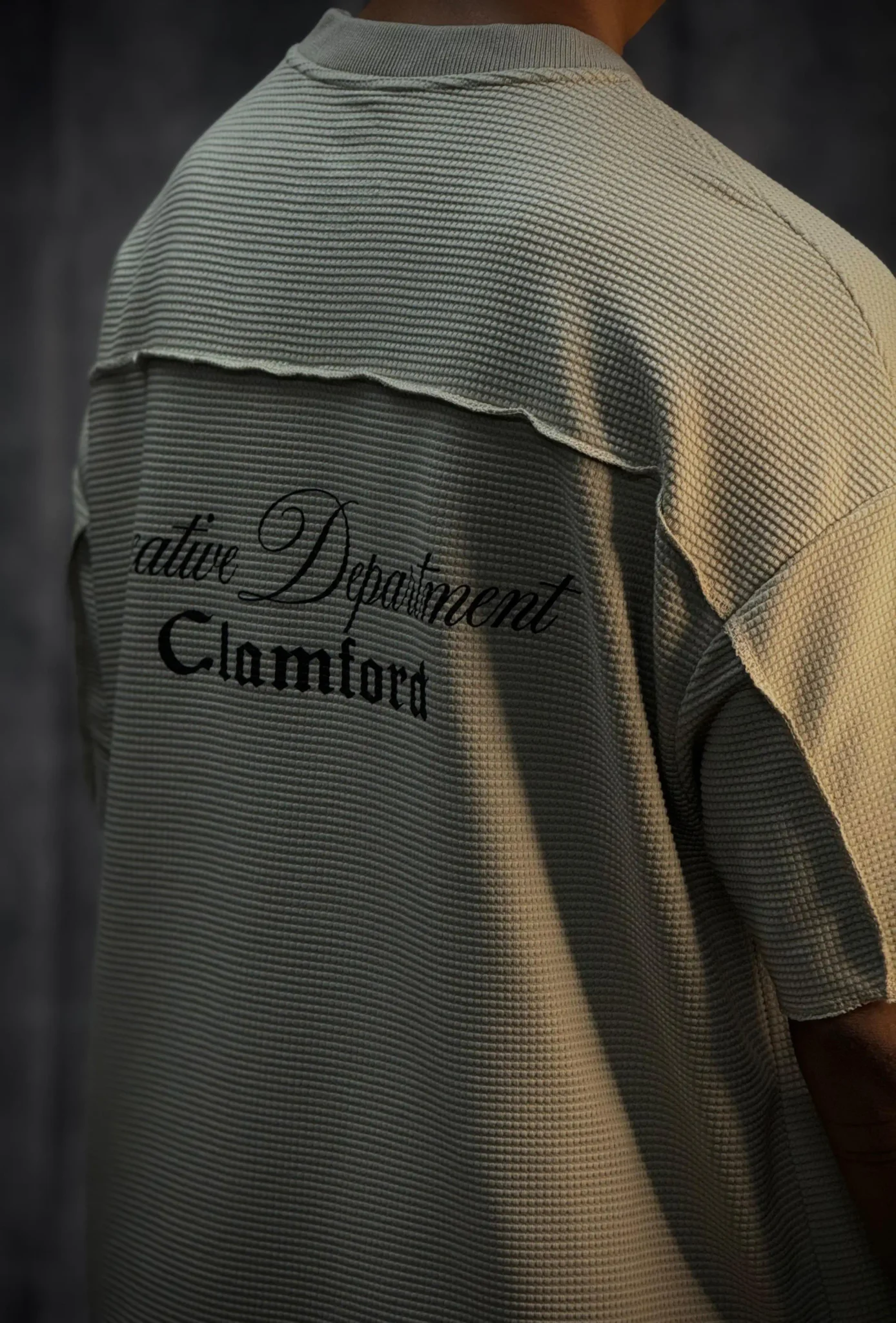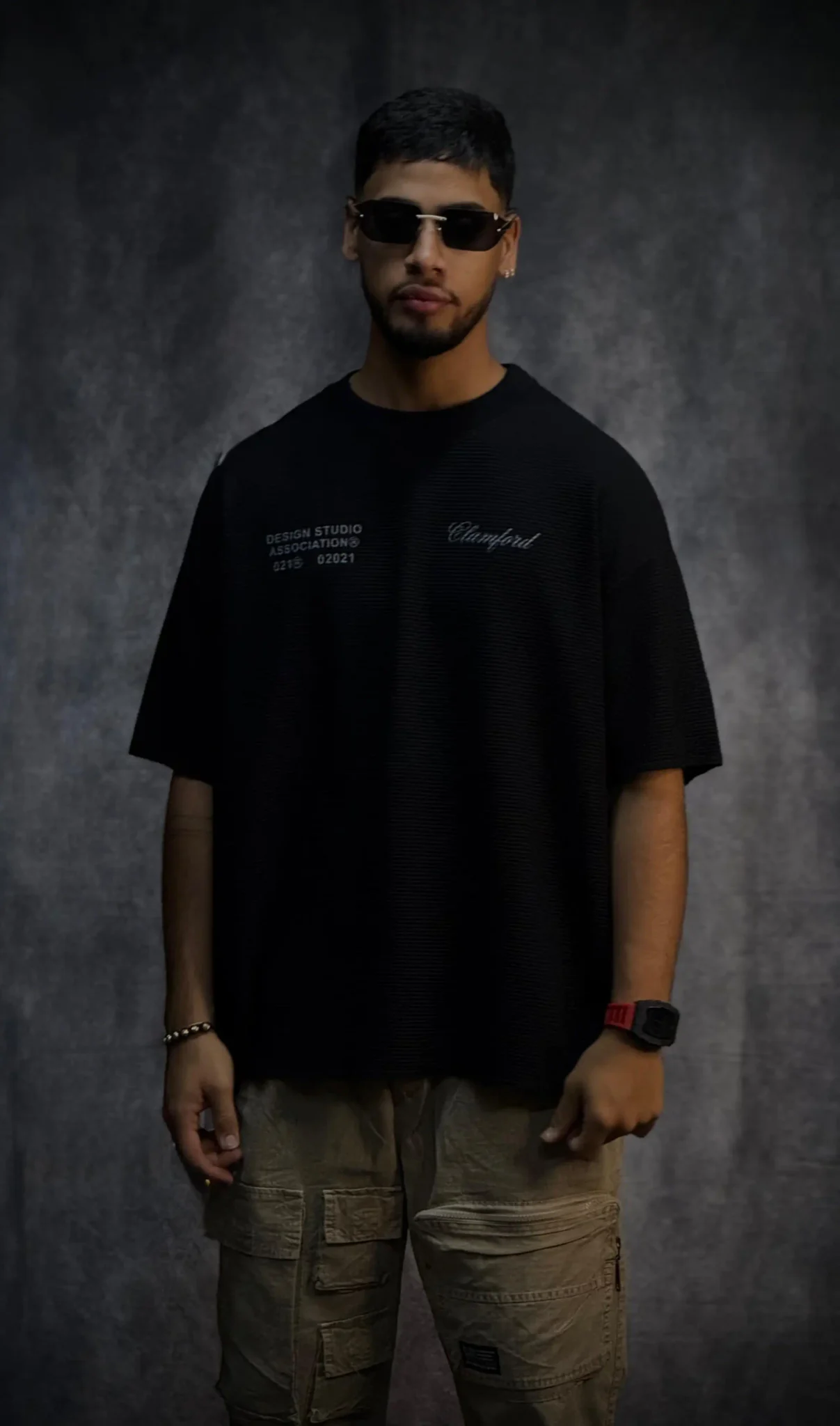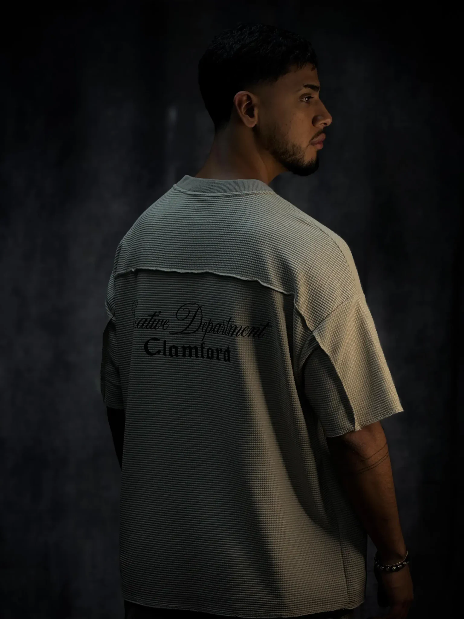 Camiseta Oversize corte boxy fit en tela texturizada de 290 gramos, terminaciones en sus mangas y parte baja en costura para un acabado limpio y estructurado. Incorpora diseño de costuras en la parte trasera con estampados y textos Clamford. Adelante tiene un aplique de la marca y el cuello tejido aporta un toque premium y eleva el estilo de la prenda.