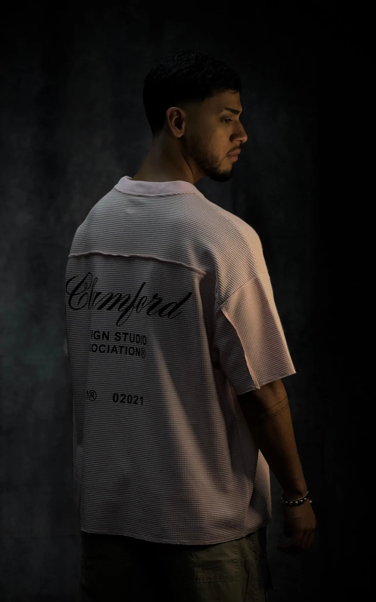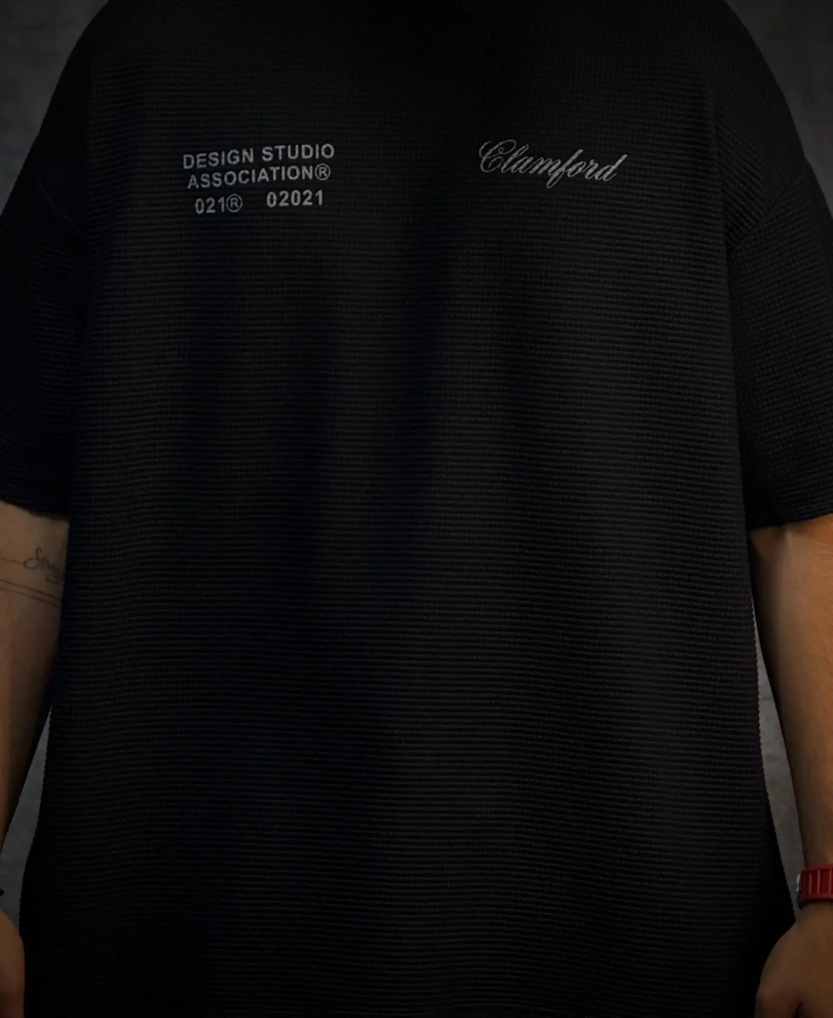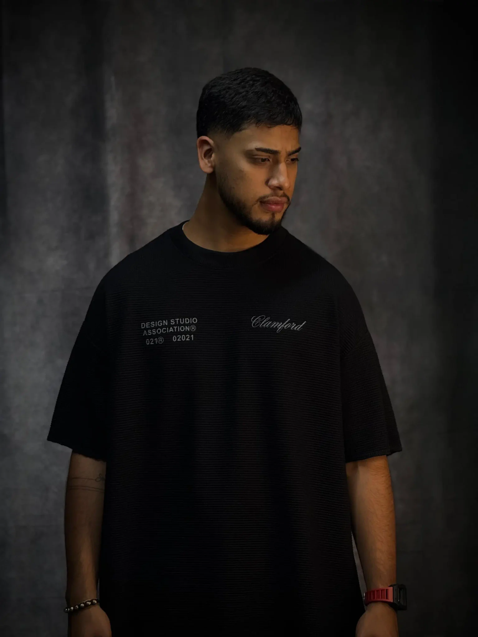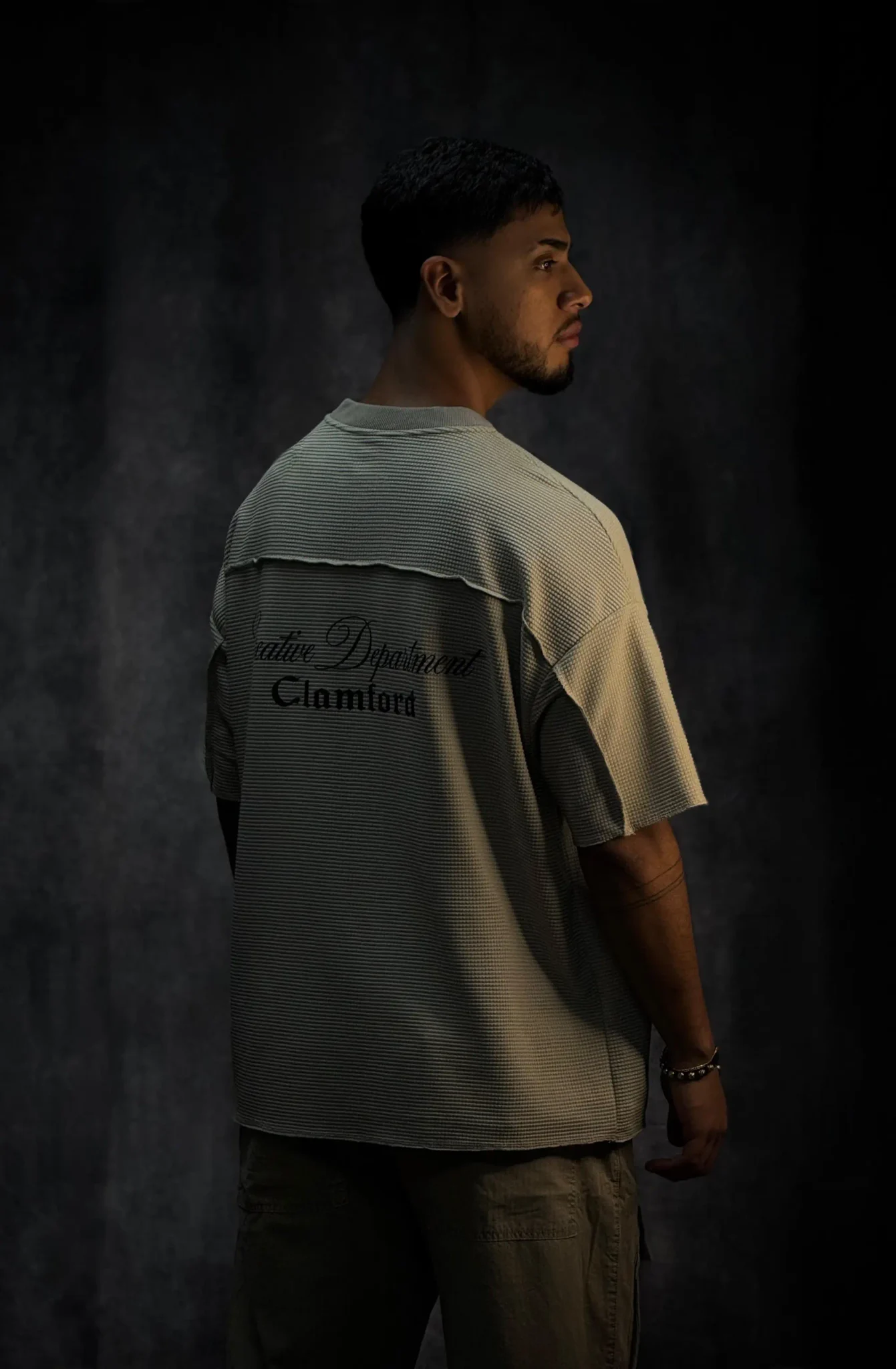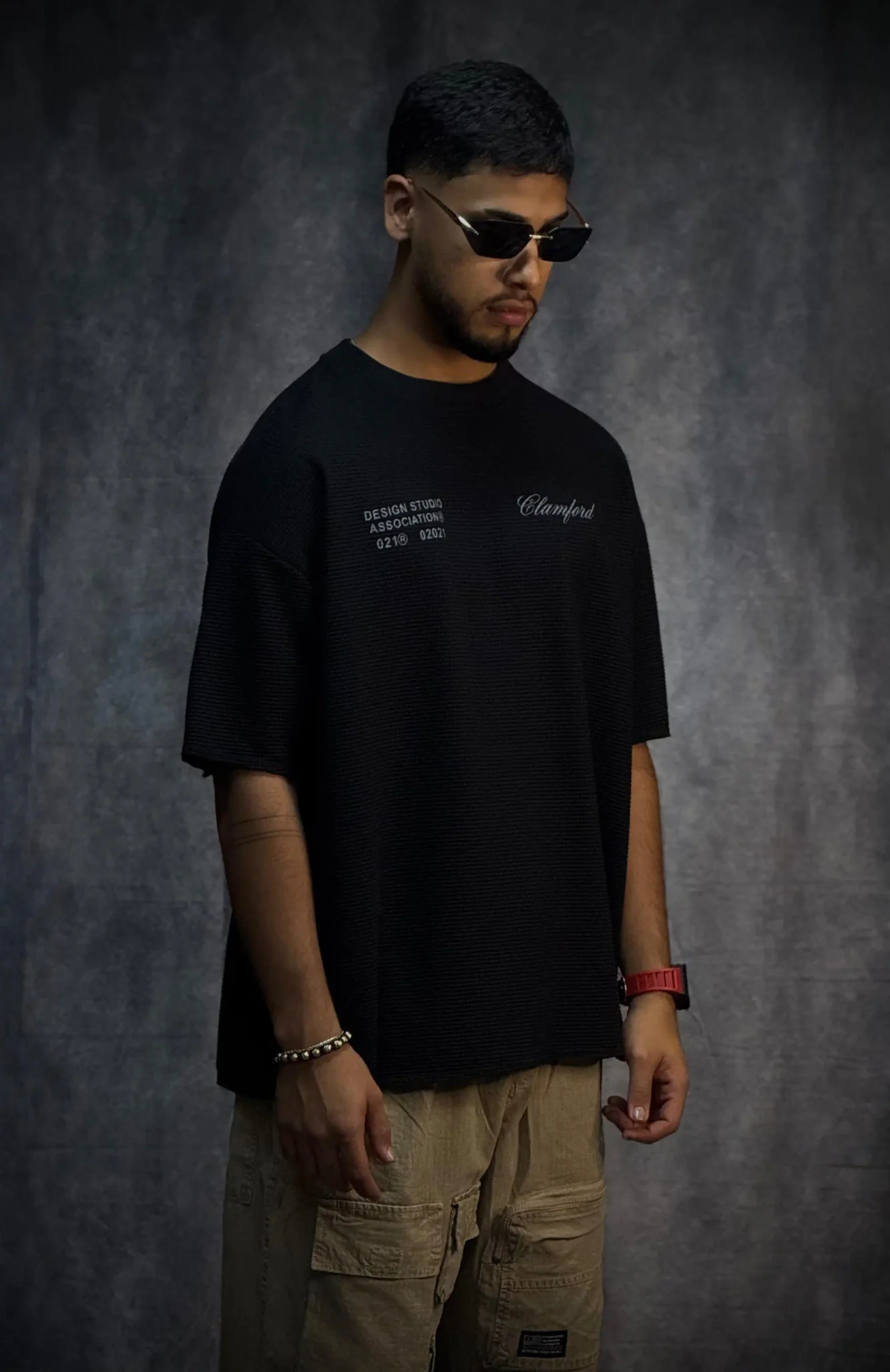 Camiseta Oversize corte boxy fit en tela texturizada de 290 gramos, terminaciones en sus mangas y parte baja en costura para un acabado limpio y estructurado. Incorpora diseño de costuras en la parte trasera con estampados y textos Clamford. Adelante tiene un aplique de la marca y el cuello tejido aporta un toque premium y eleva el estilo de la prenda.
