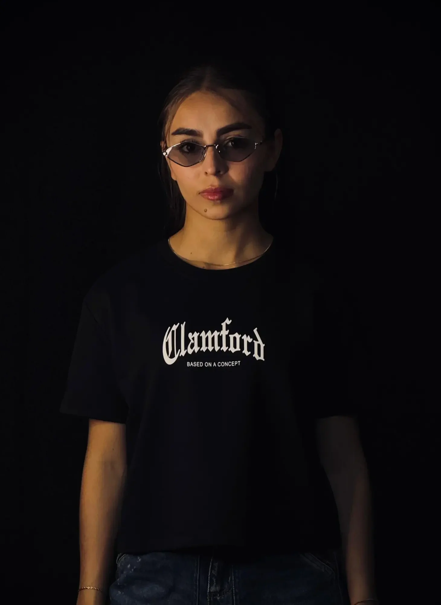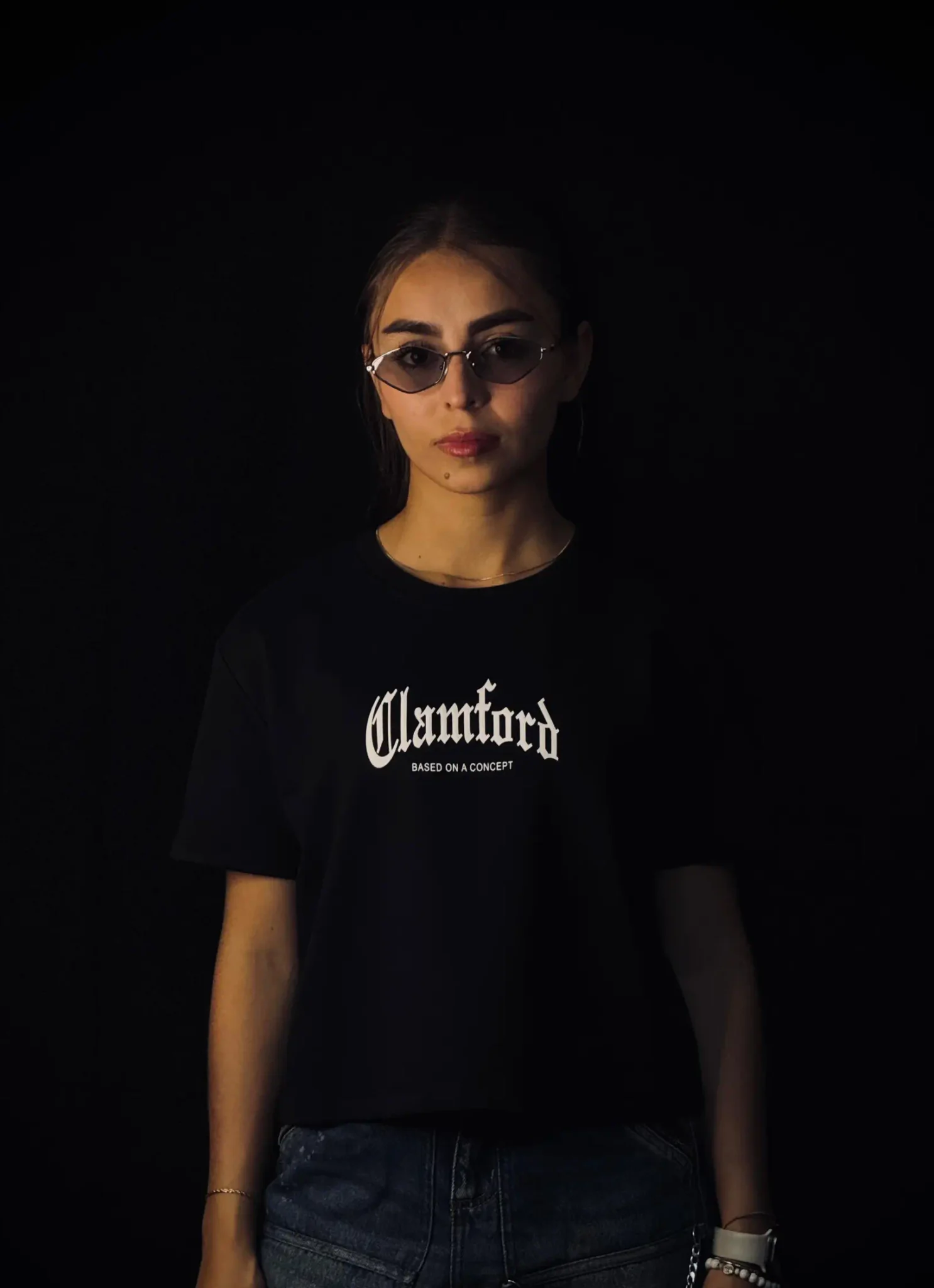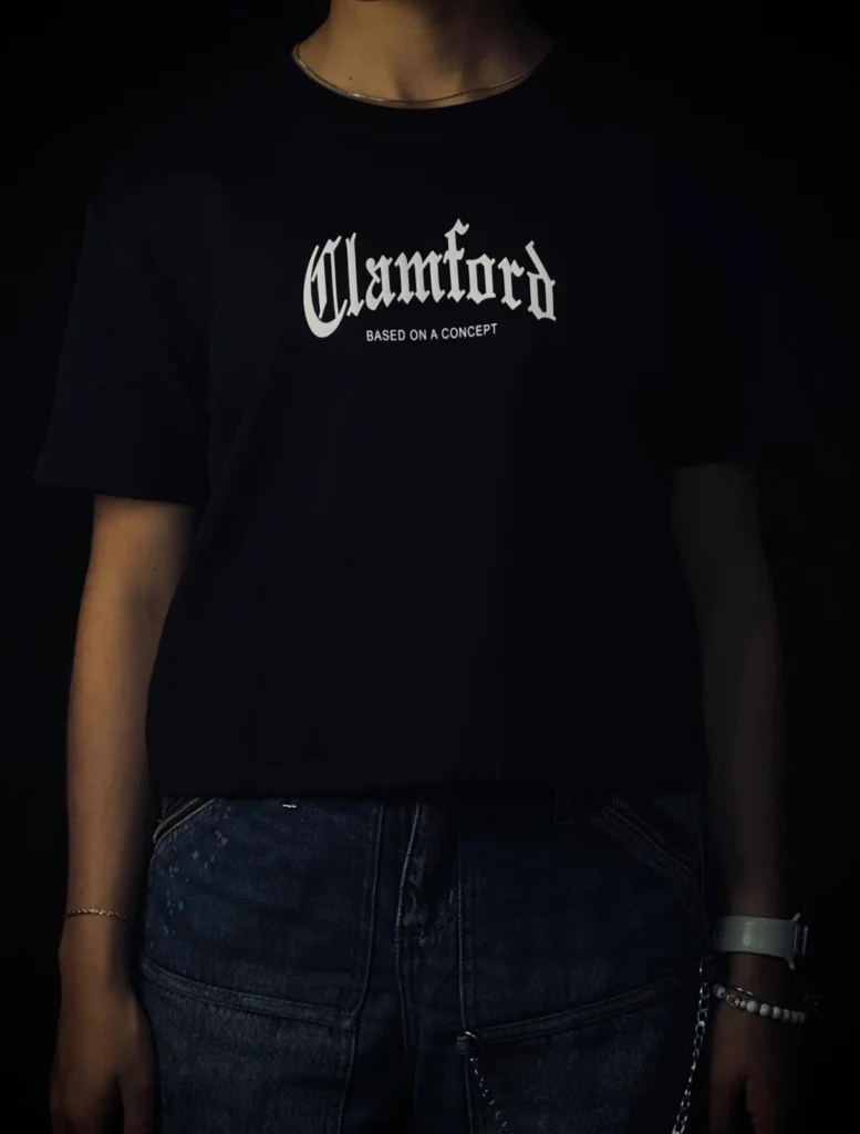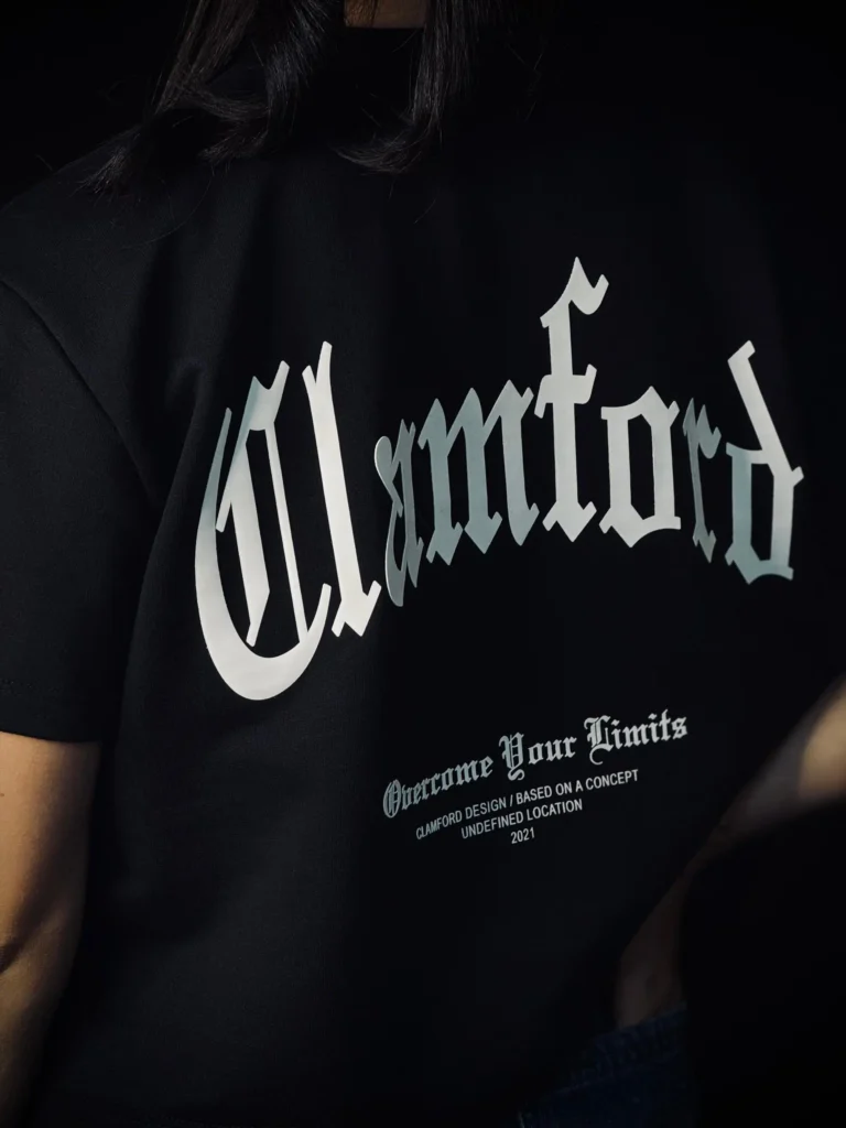 Camiseta oversize confeccionado en tela premium de alto gramaje de 250 gramos, que aporta estructura y durabilidad. Presenta texto estampado en alta densidad sobre el pecho delantero y en la parte trasera un texto de la marca Clamford, resaltando identidad y estilo urbano.