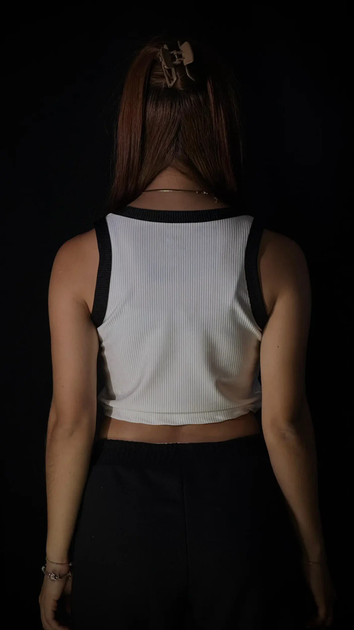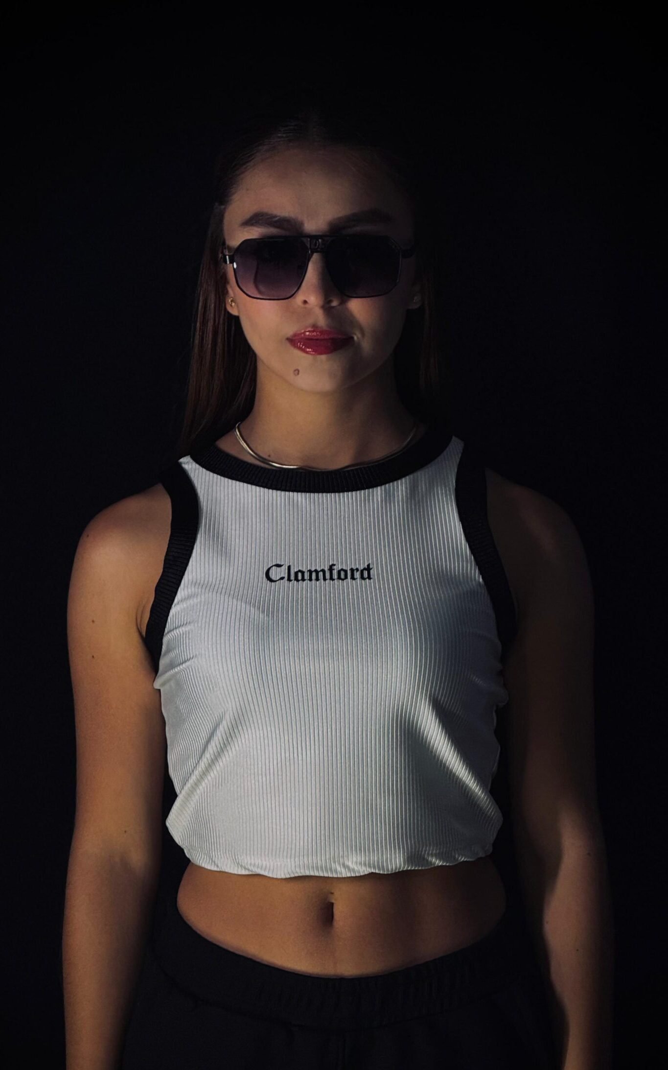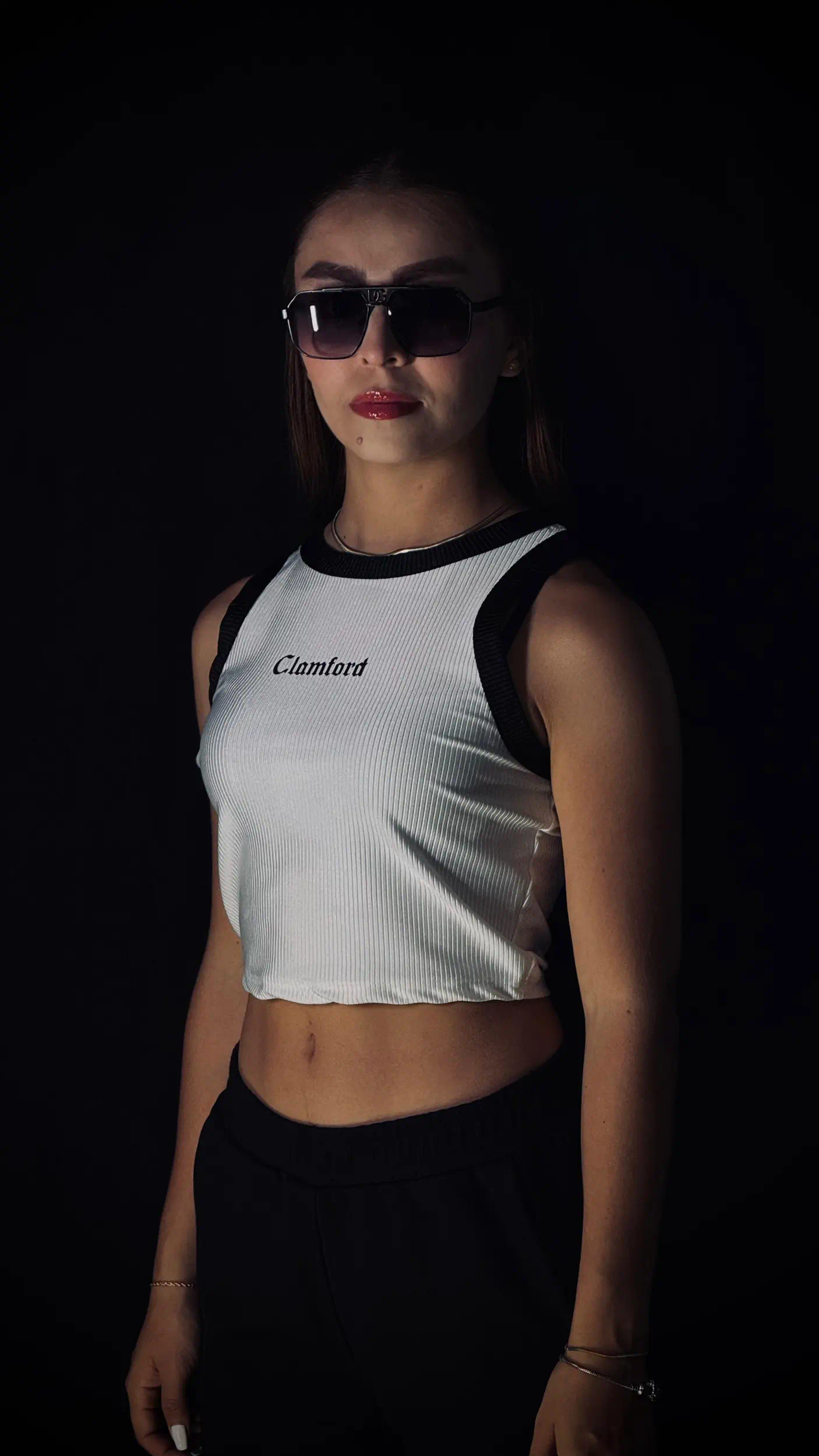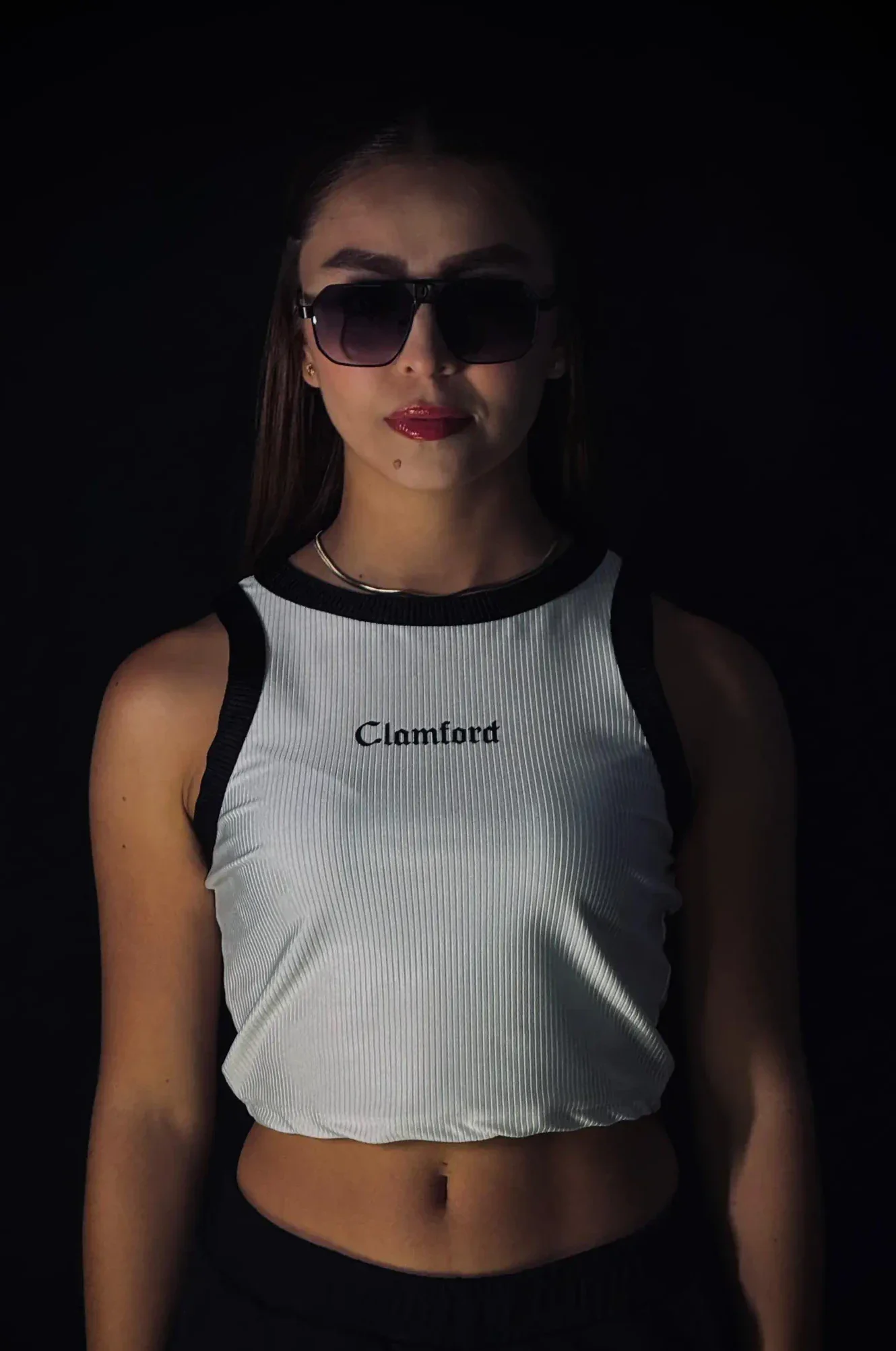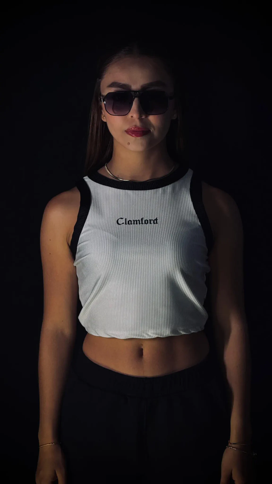 Top crop Clamford sin mangas, confeccionado en tejido acanalado de alta elasticidad, sisa amplia para mayor comodidad y rib contrastante en cuello y hombros. Ajuste ceñido, fresco y ideal para un look urbano premium.
