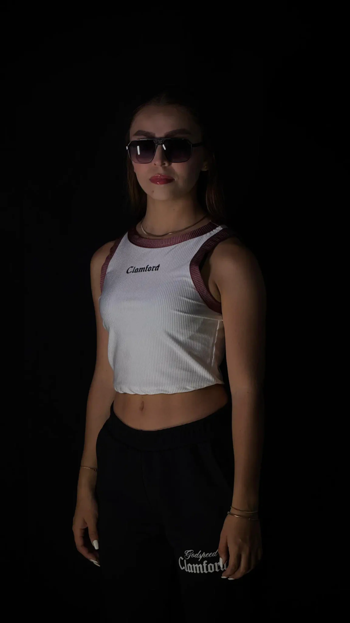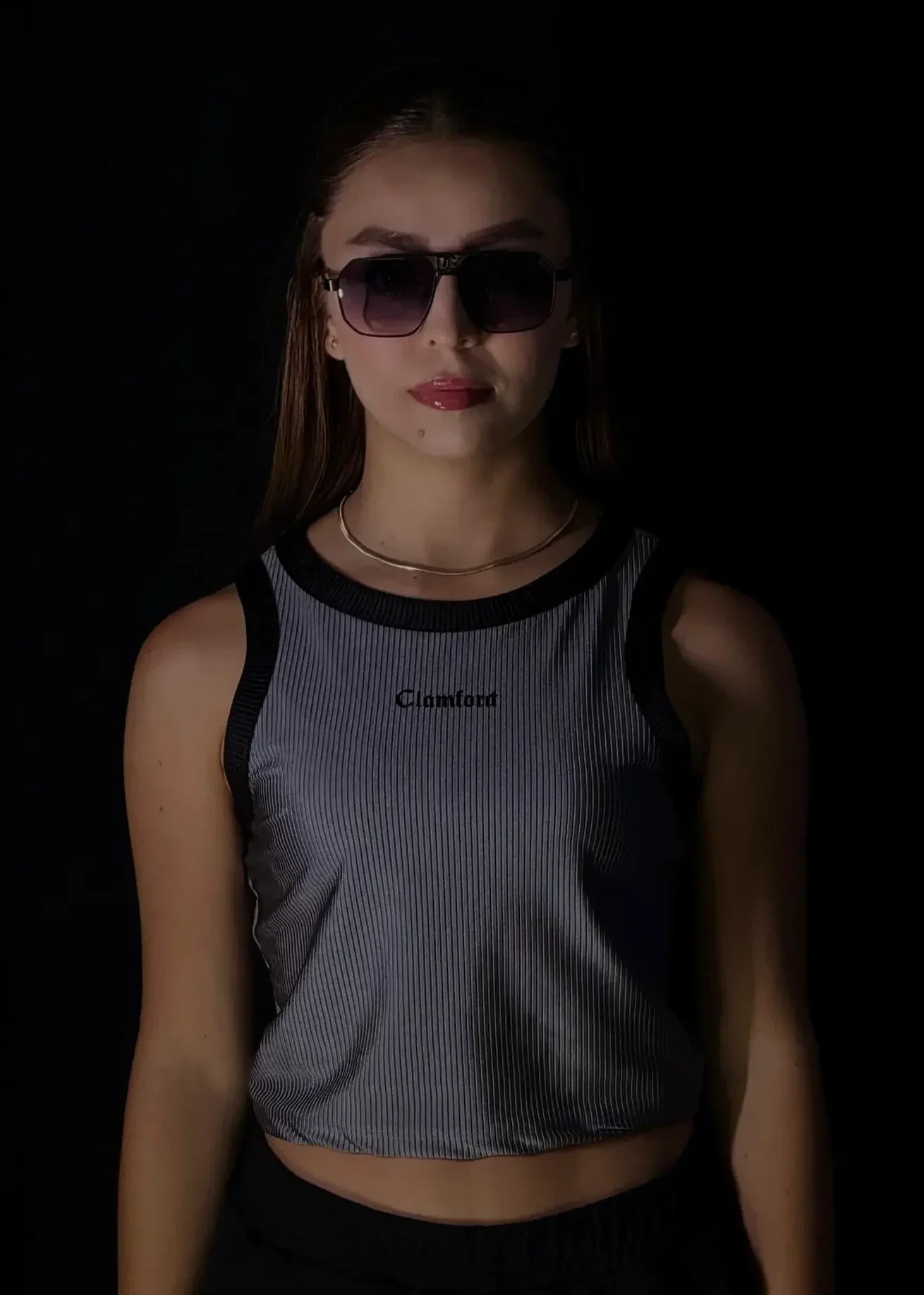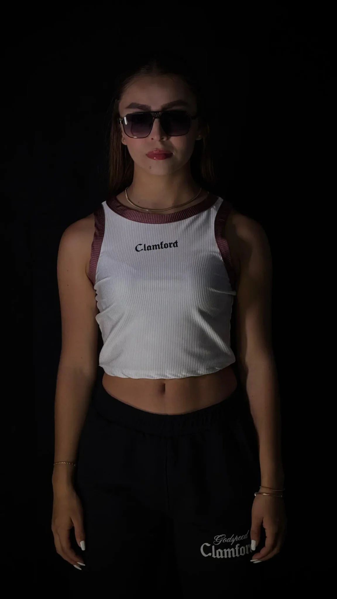 Top crop Clamford sin mangas, confeccionado en tejido acanalado de alta elasticidad, sisa amplia para mayor comodidad y rib contrastante en cuello y hombros. Ajuste ceñido, fresco y ideal para un look urbano premium.