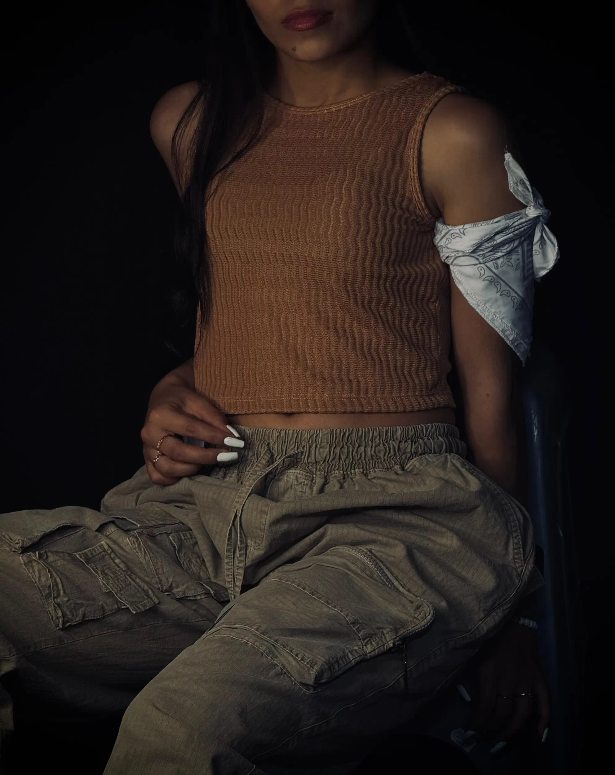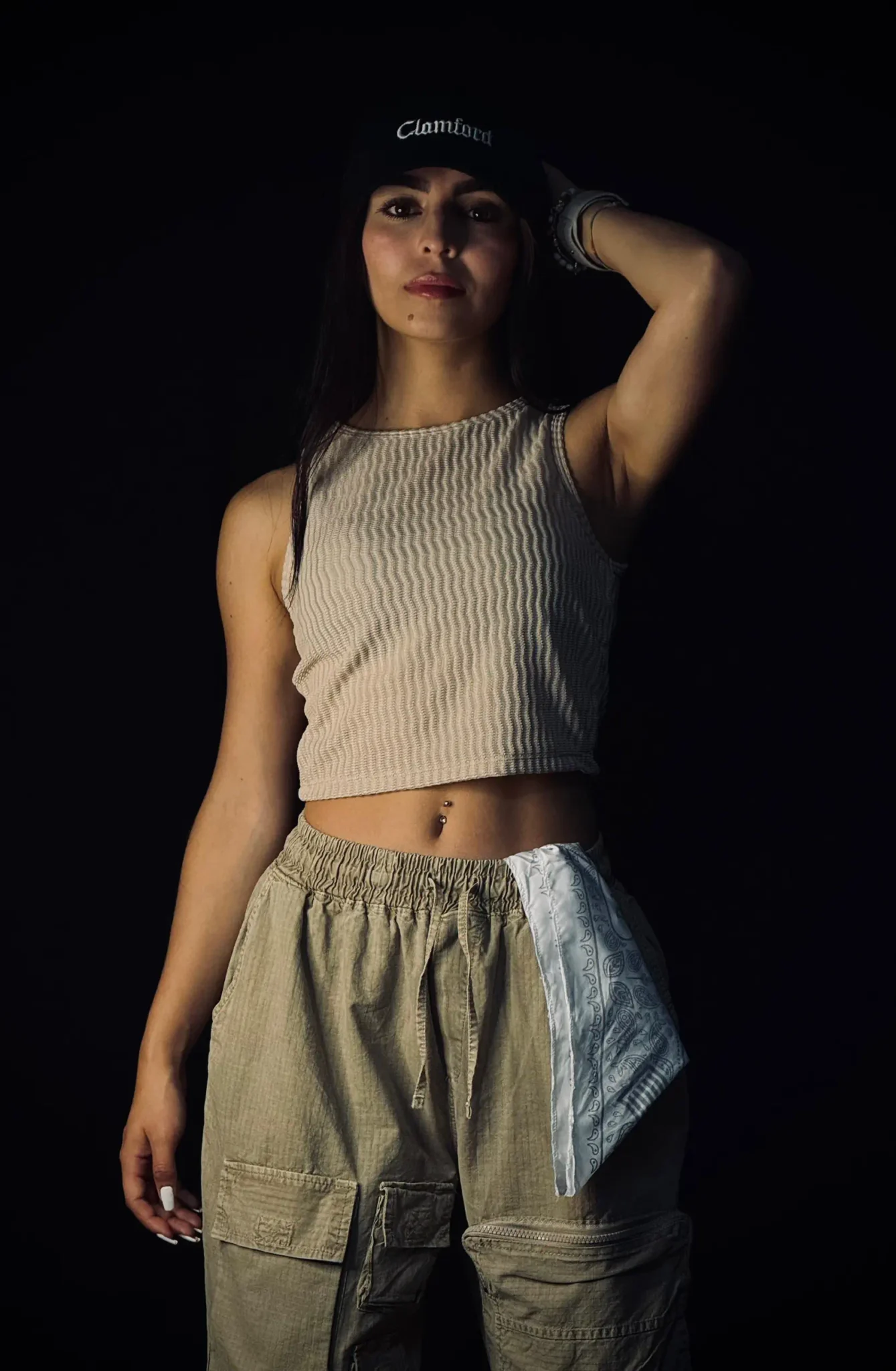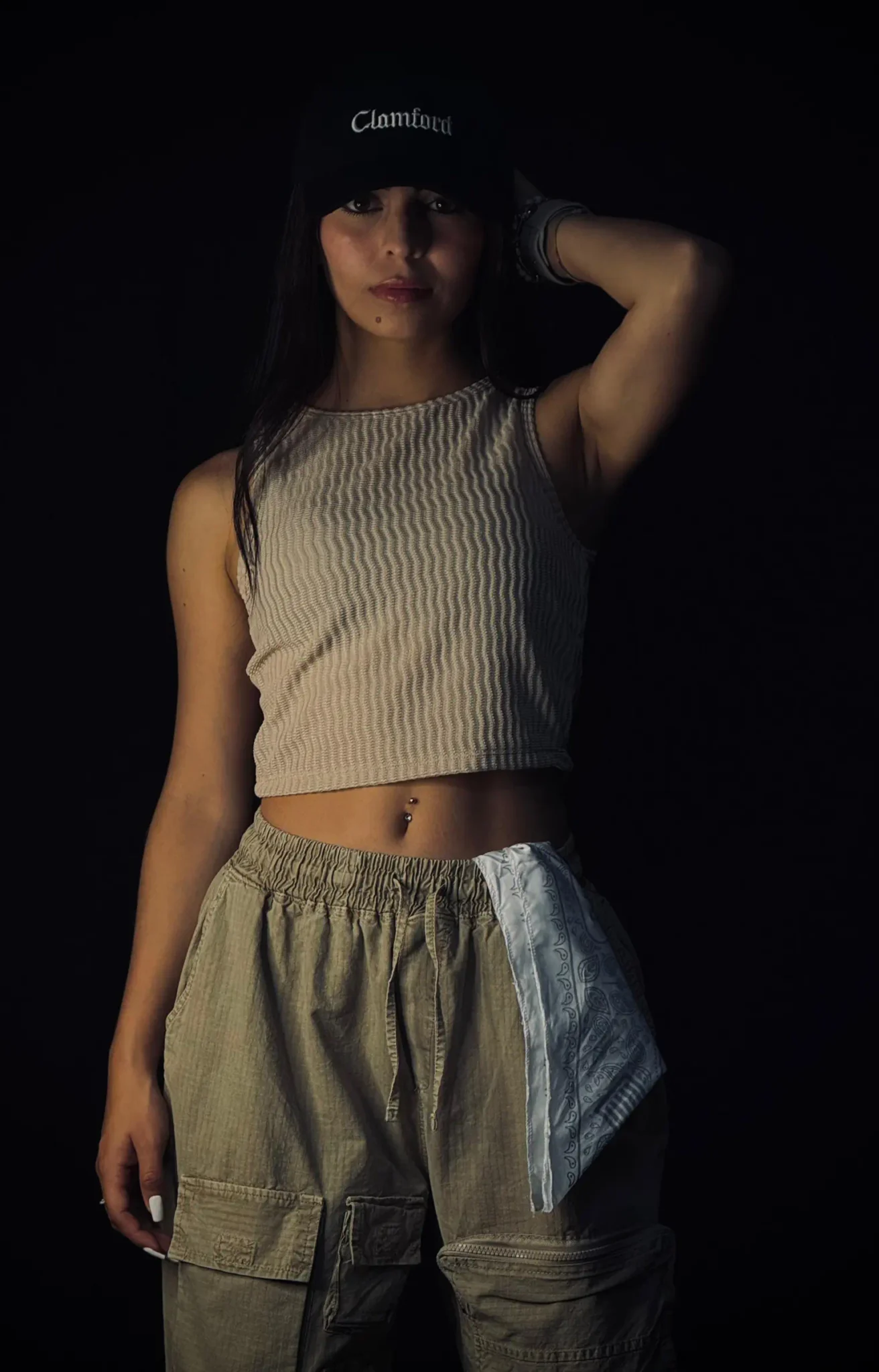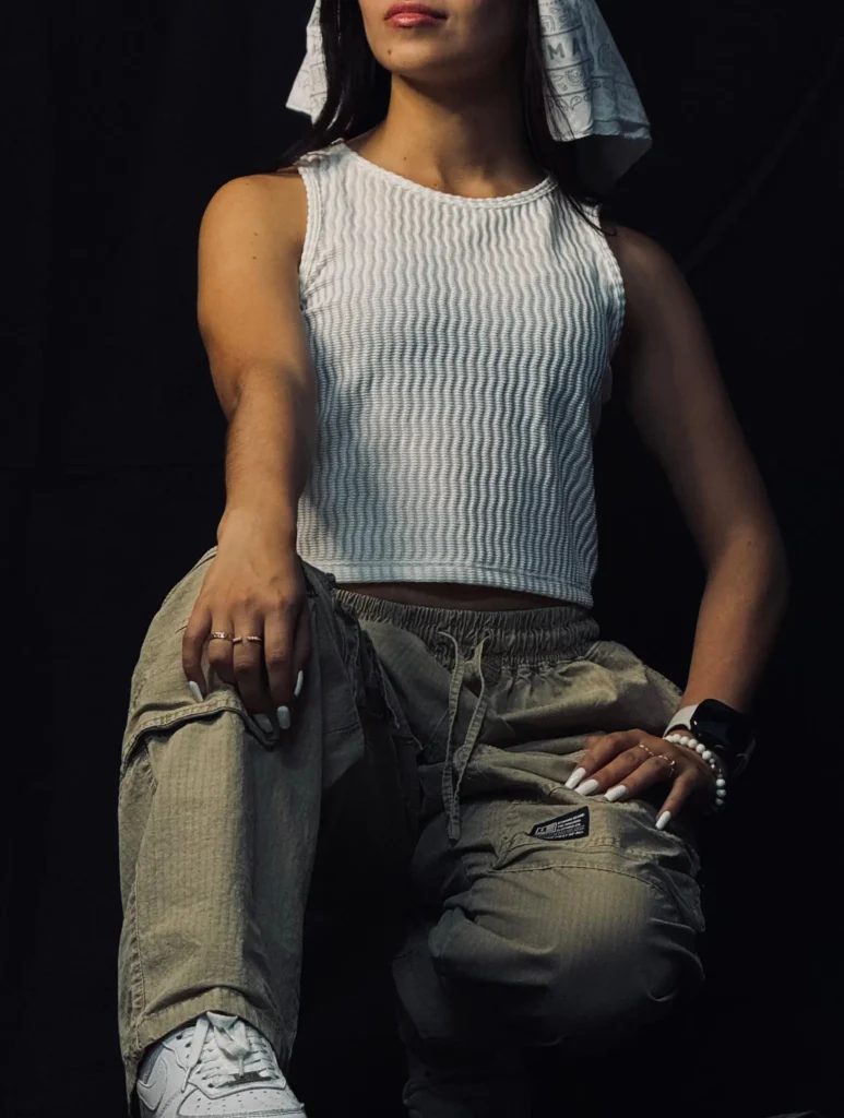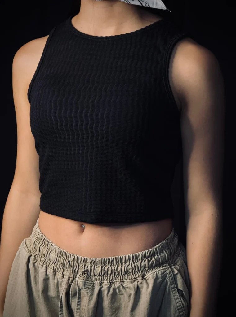 Crop top manga size en tela texturizada (80% algodón, 20% poliéster), ligero y elástico para un ajuste ceñido y cómodo. Con un diseño fresco y versátil que realza el estilo básico con un toque moderno.