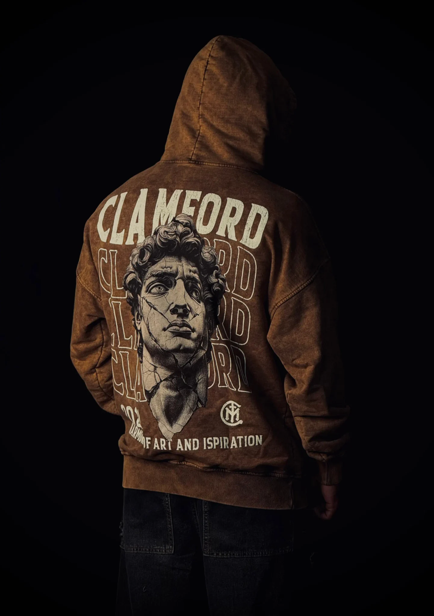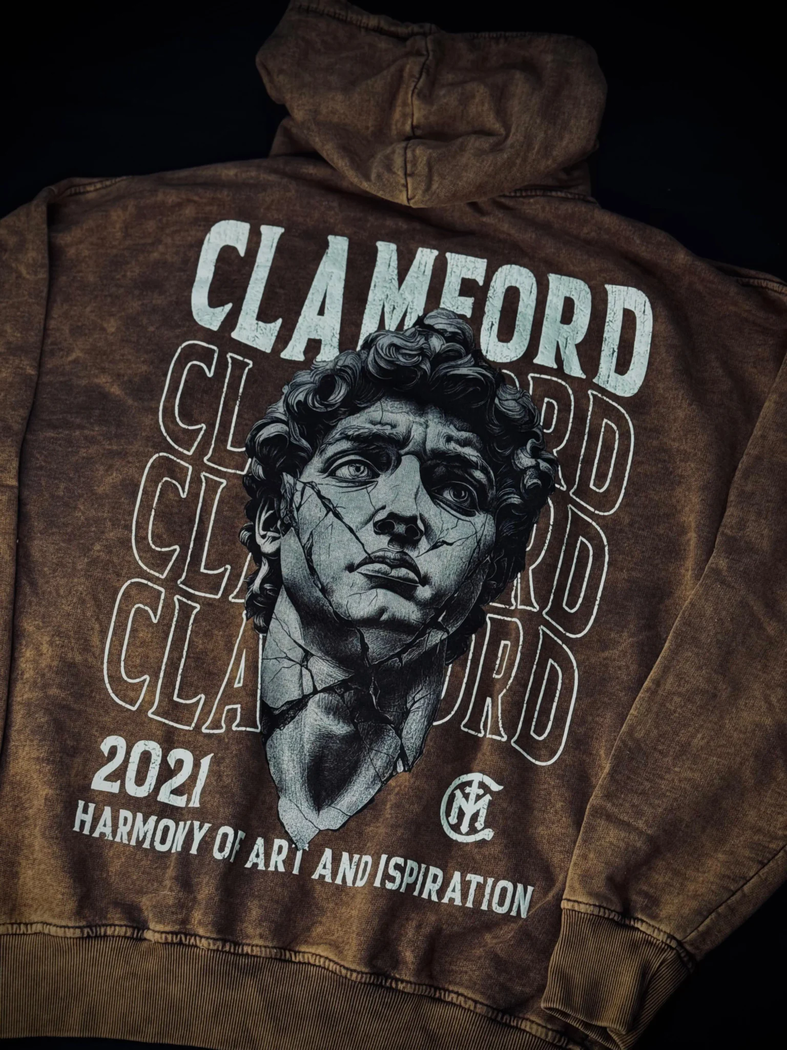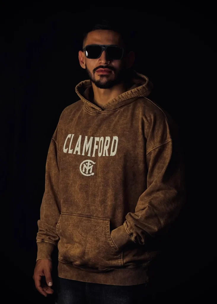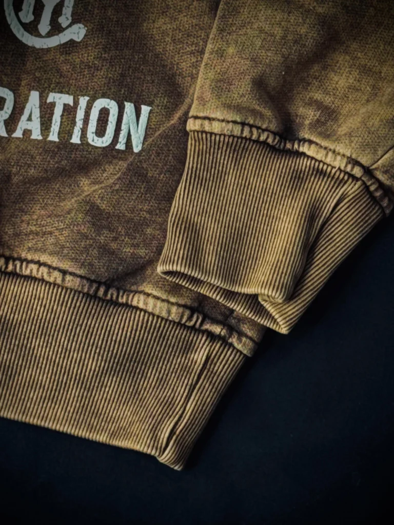 Buzo Oversize confeccionado en una Burda Premium de 320gr de peso, con cuello, fajon y puños en rib. La tela tiene procesos de lavandería industrial y la prenda presenta estampados de alta densidad y textil, tanto en la parte frontal como en la parte trasera.