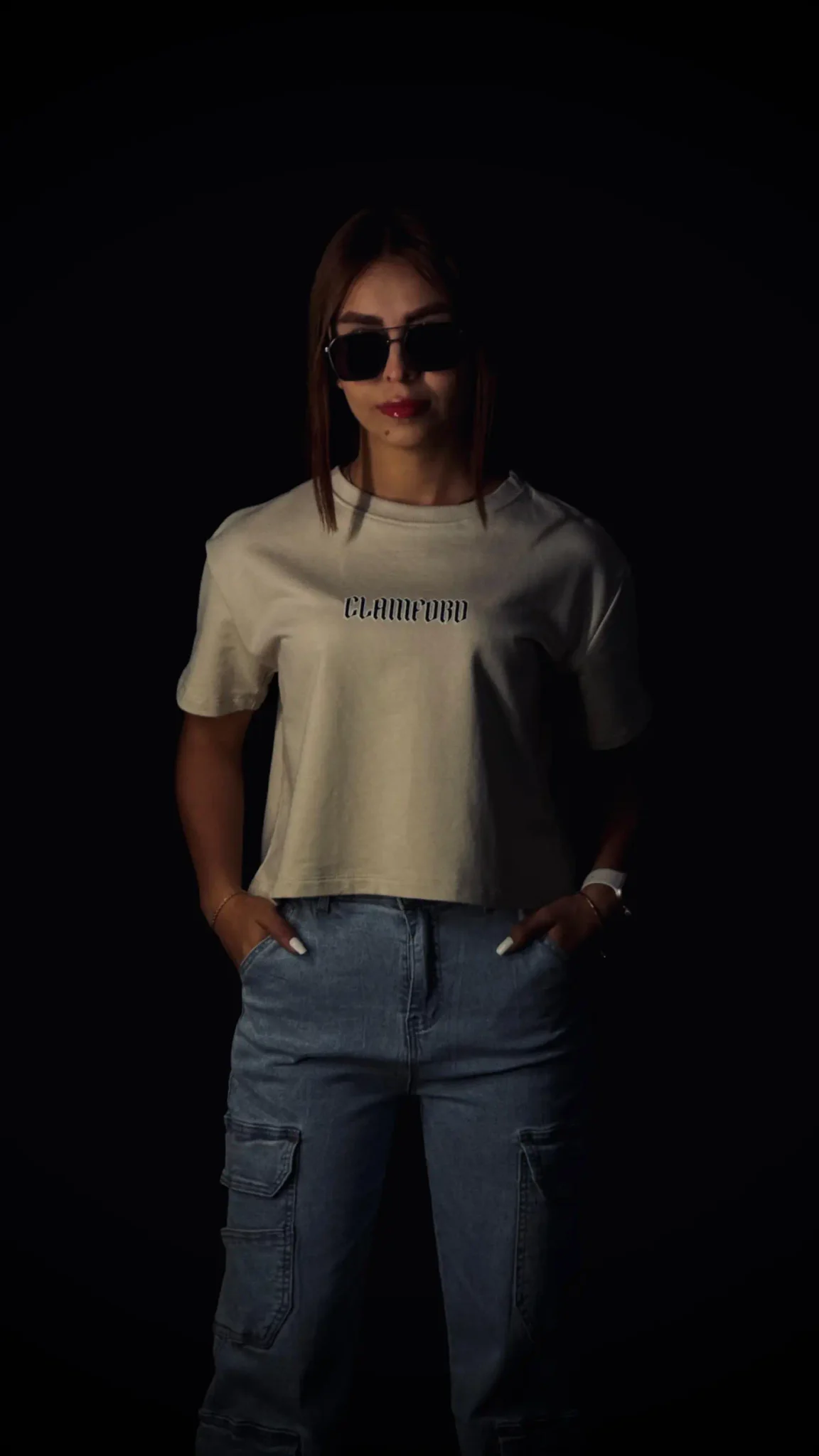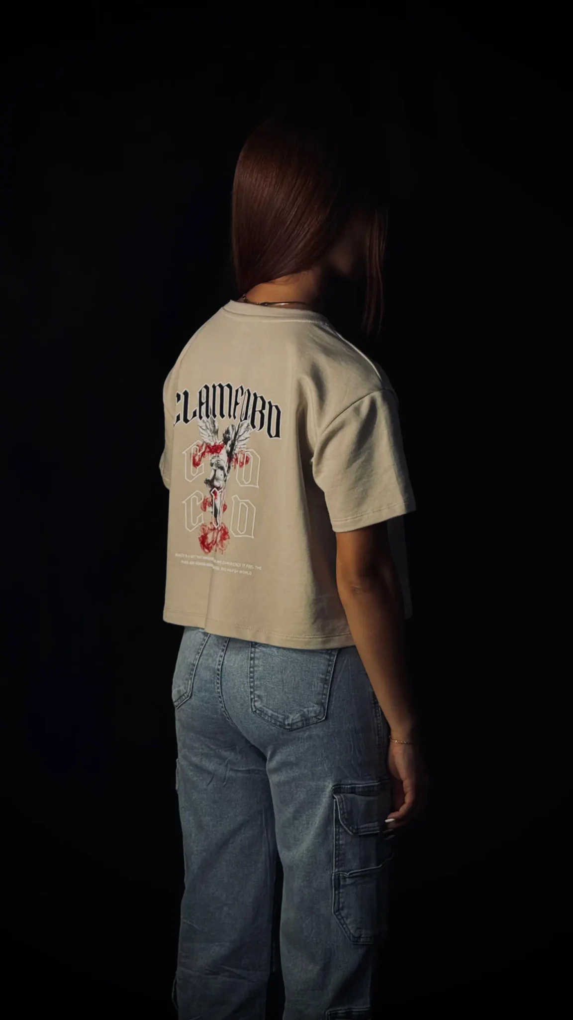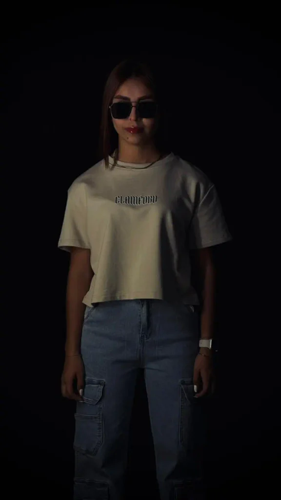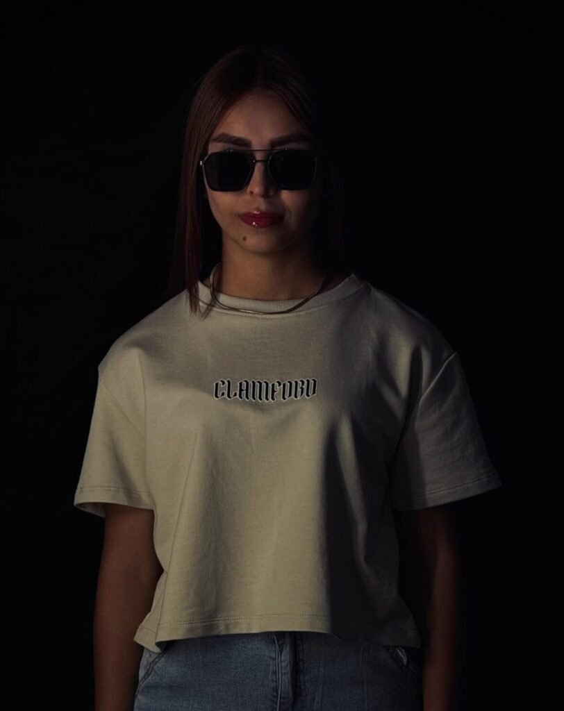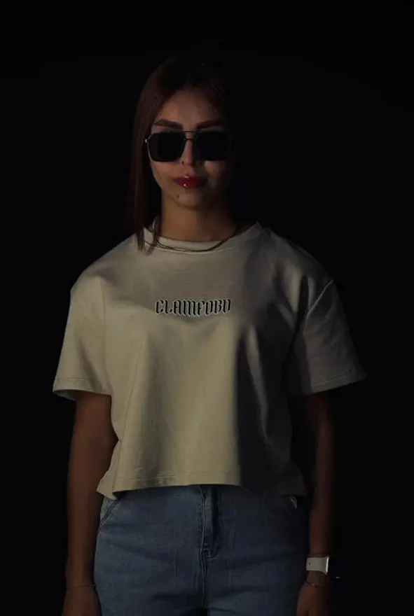 Camiseta oversize corta de dama, con corte preciso a la cintura, confeccionada en burda pesada premium de 280 g. Incorpora estampación frontal en puff y textil, gráfico trasero en puff con la identidad Clamford.