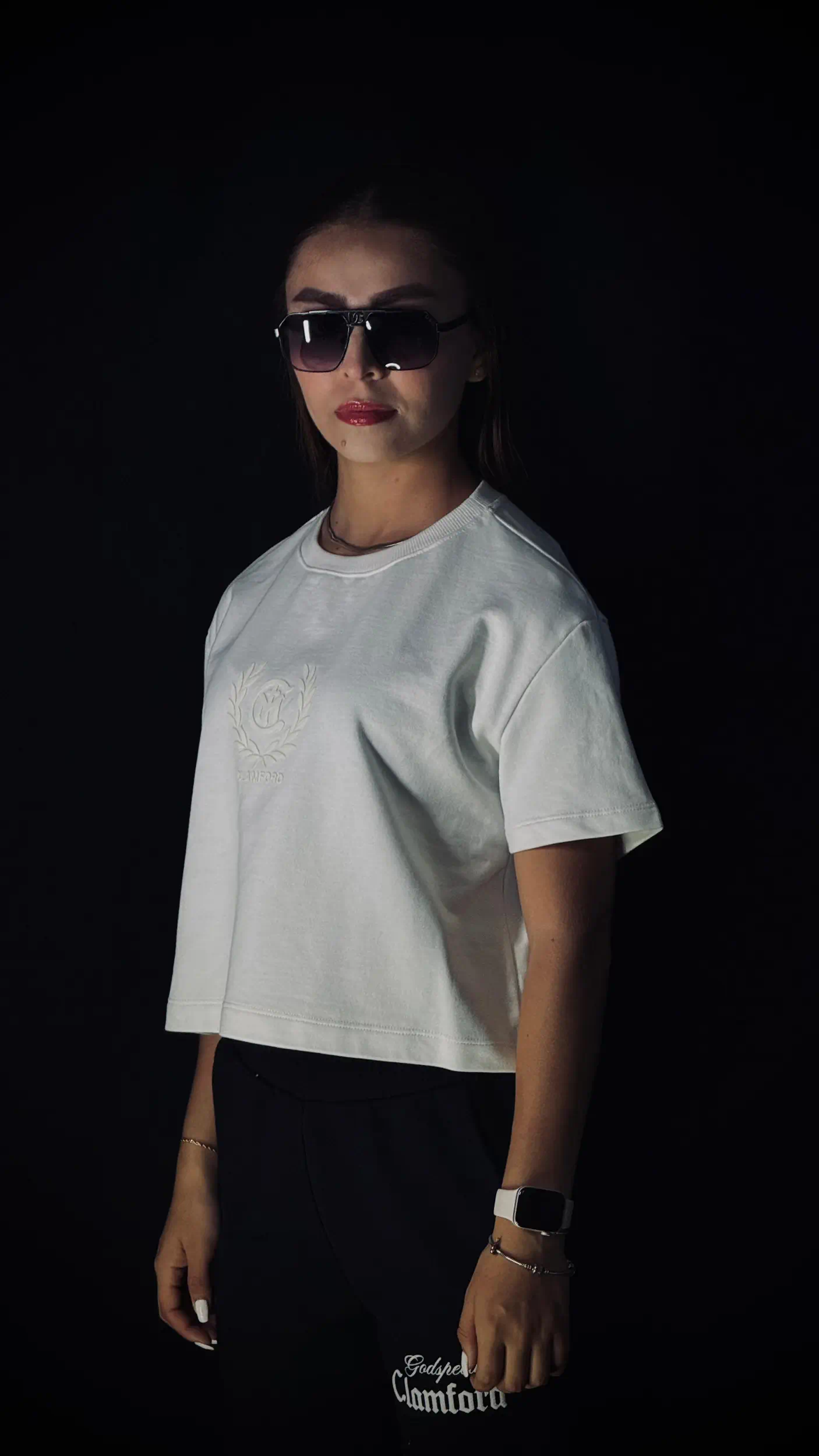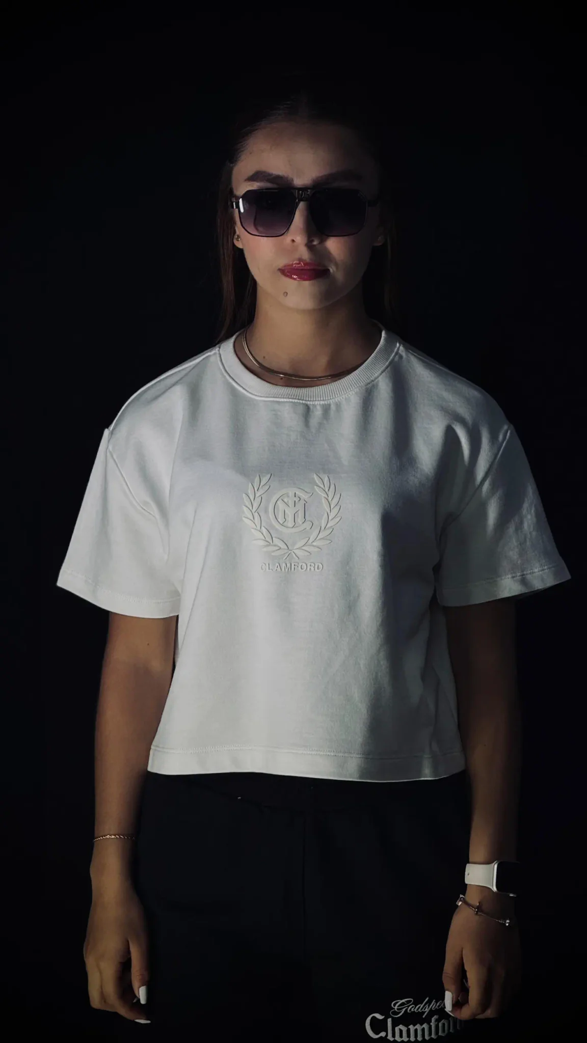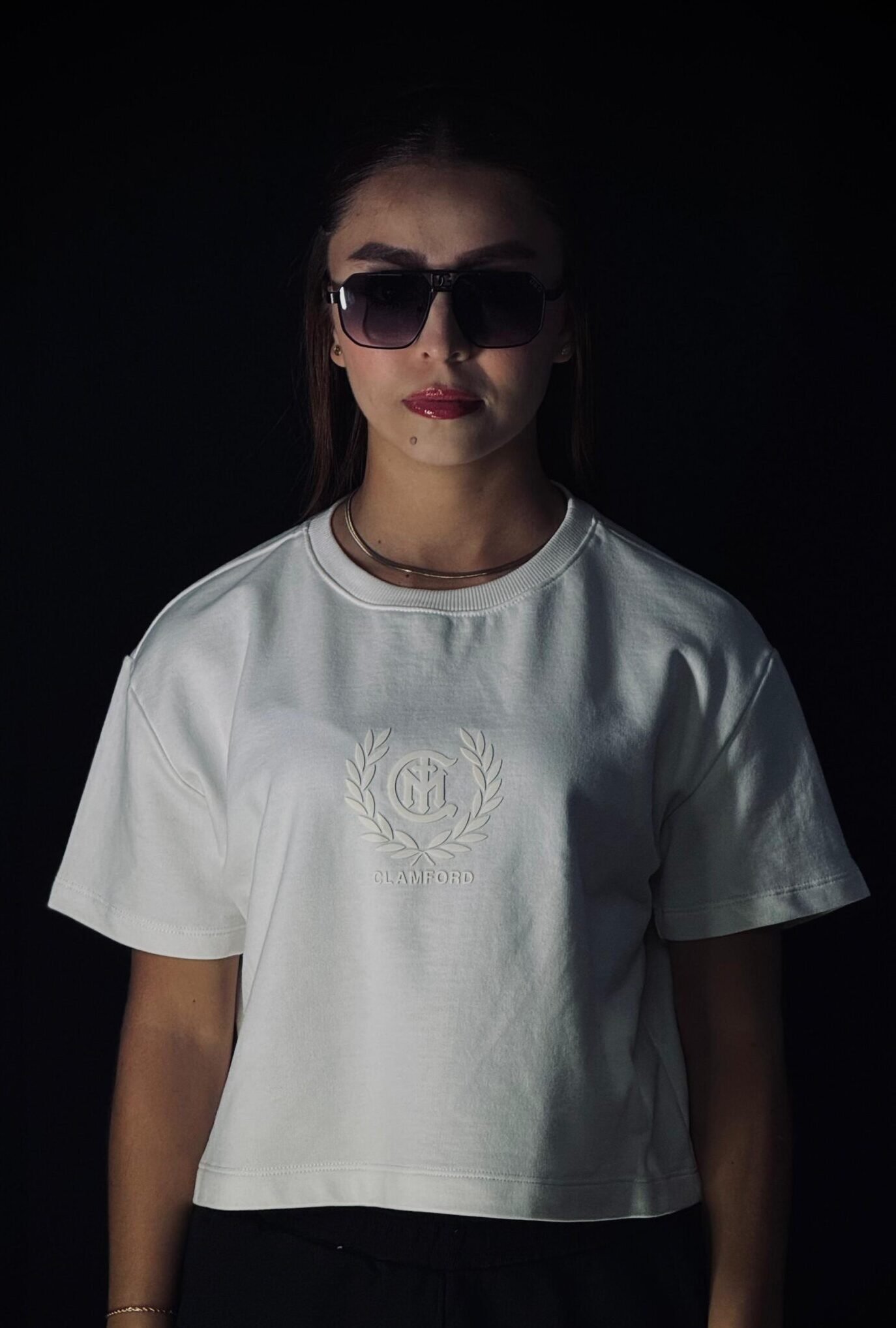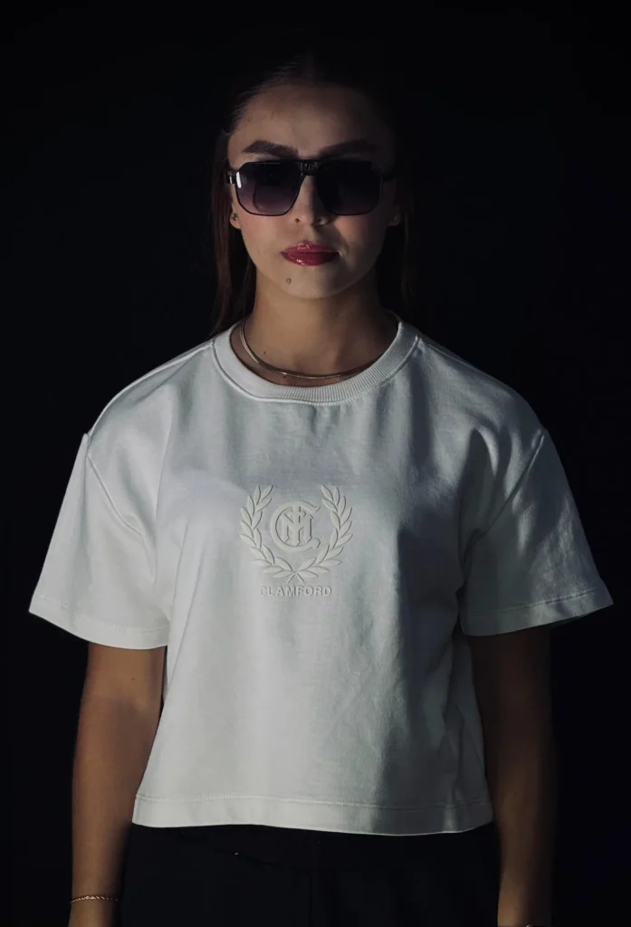 Camiseta oversize corta de dama, con corte preciso a la cintura, confeccionada en burda pesada premium de 280 g. Incorpora estampación frontal en puff y textil, gráfico trasero en puff con la identidad Clamford.ESPECIFICACIONES 100% Algodón Burda pesada 280 g Alto gramaje Oversize corto Corte a la cintura