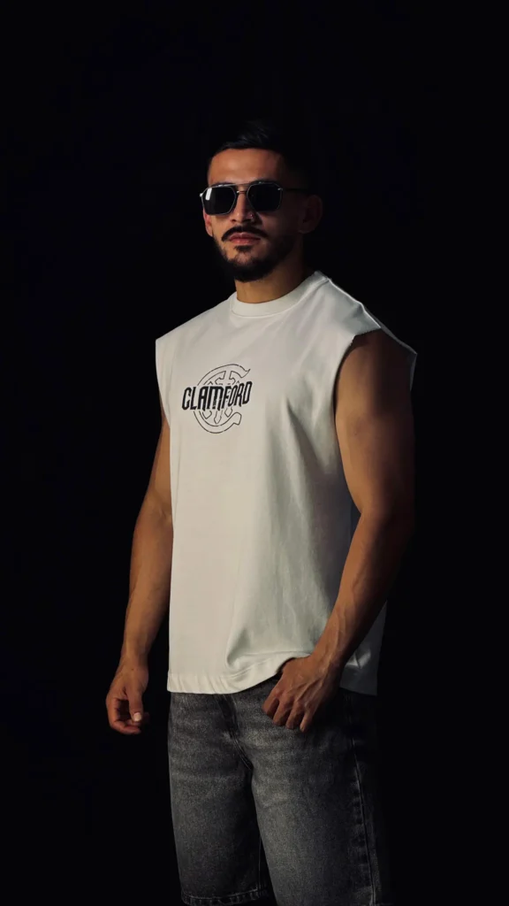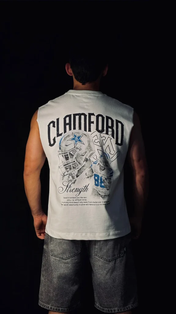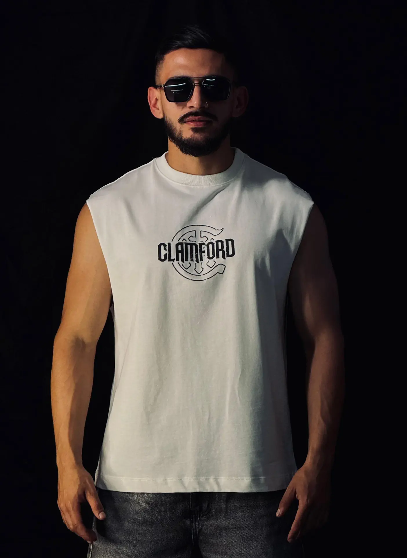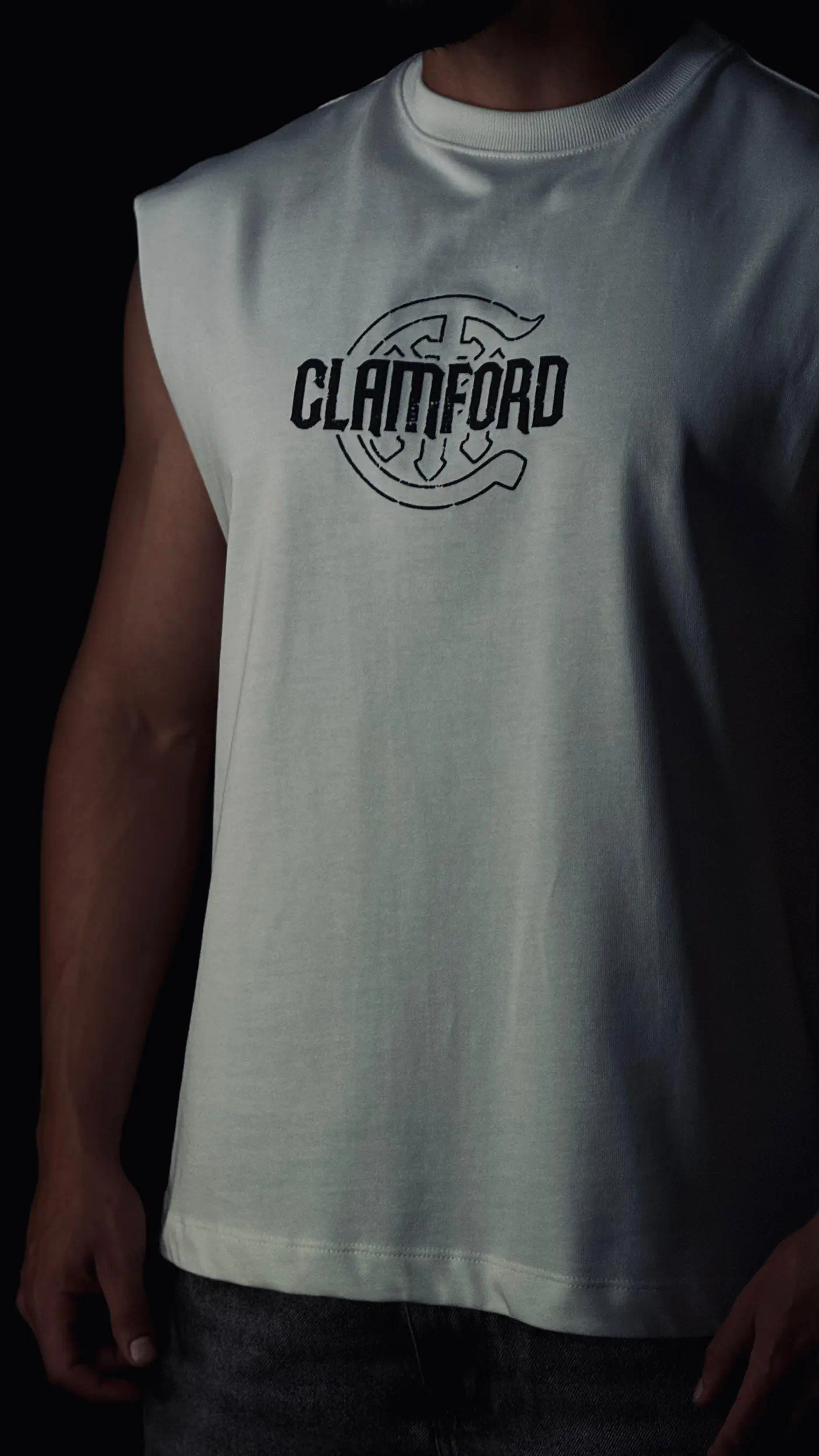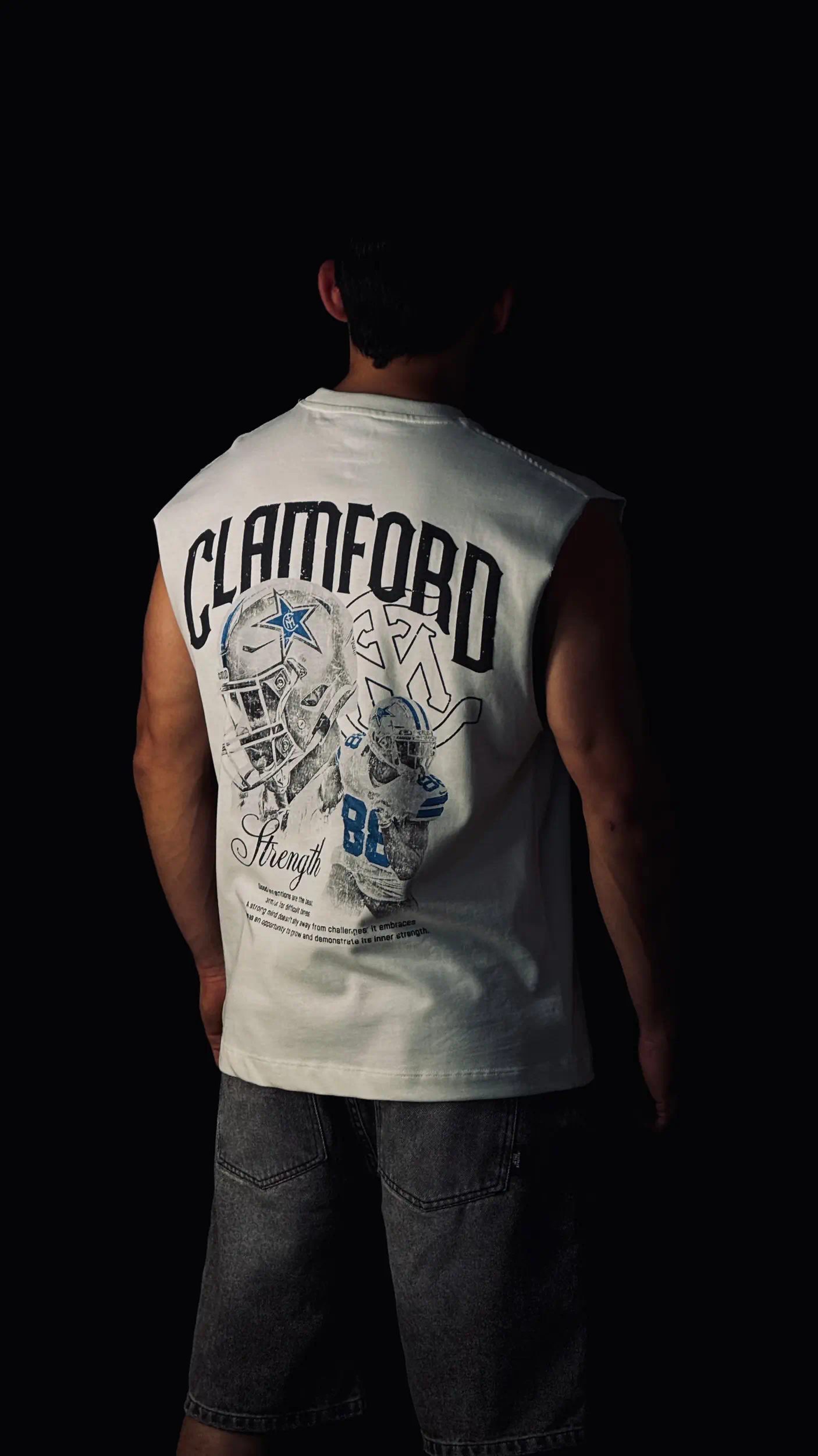 Tank oversize en jersey premium de alto gramaje (310 g). Cuenta con estampación frontal en puff y textil y gráfico trasero en puff con sello Clamford. ESPECIFICACIONES